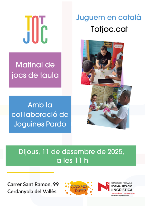 El dia 11 de desembre, els cursos de català de Cerdanyola acomiadaran el trimestre jugant a jocs de taula en català. L’activitat serà conduïda pel personal de l’establiment Joguines Pardo, adherit al programa Totjoc.