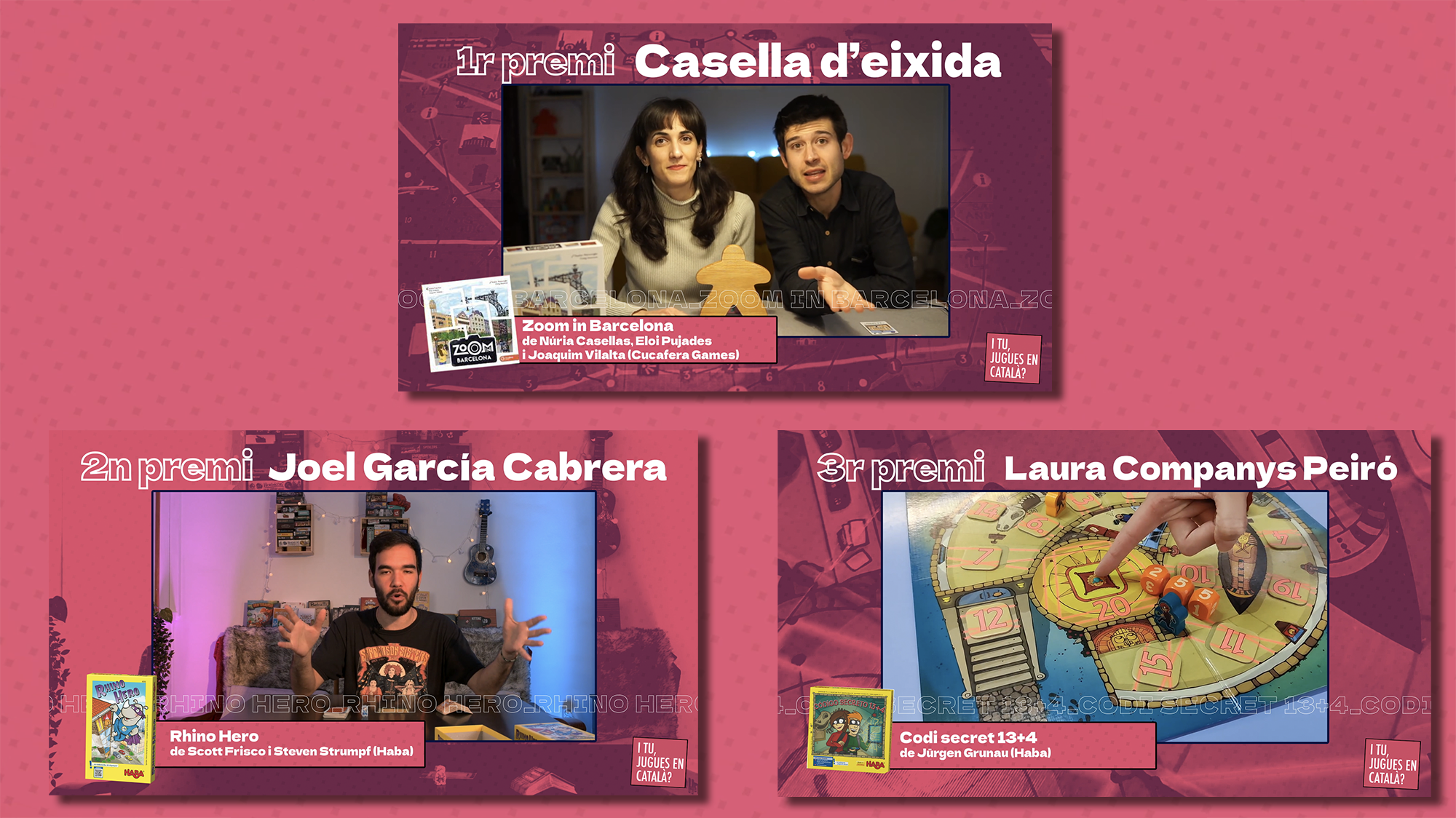 El primer premi -que consisteix en un IPad, un val d'Abacus de 50 € i un lot de jocs en català- s'ha atorgat a Carles Palanca, que ha presentat un tutorial del joc Zoom in Barcelona, de l'editorial Cucafera Games. El joc de taula consisteix a viatjar per tot Barcelona per aconseguir la millor fotografia de la ciutat. Carles Palanca, juntament amb Carla Rubio, tots dos del País Valencià, condueixen Casella d'Eixida (@casellaeixida), un canal de jocs de taula amb presència en diferents xarxes socials.