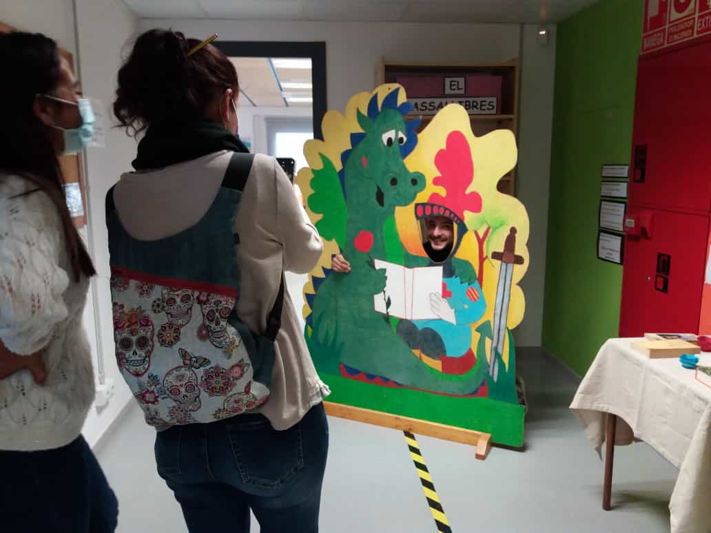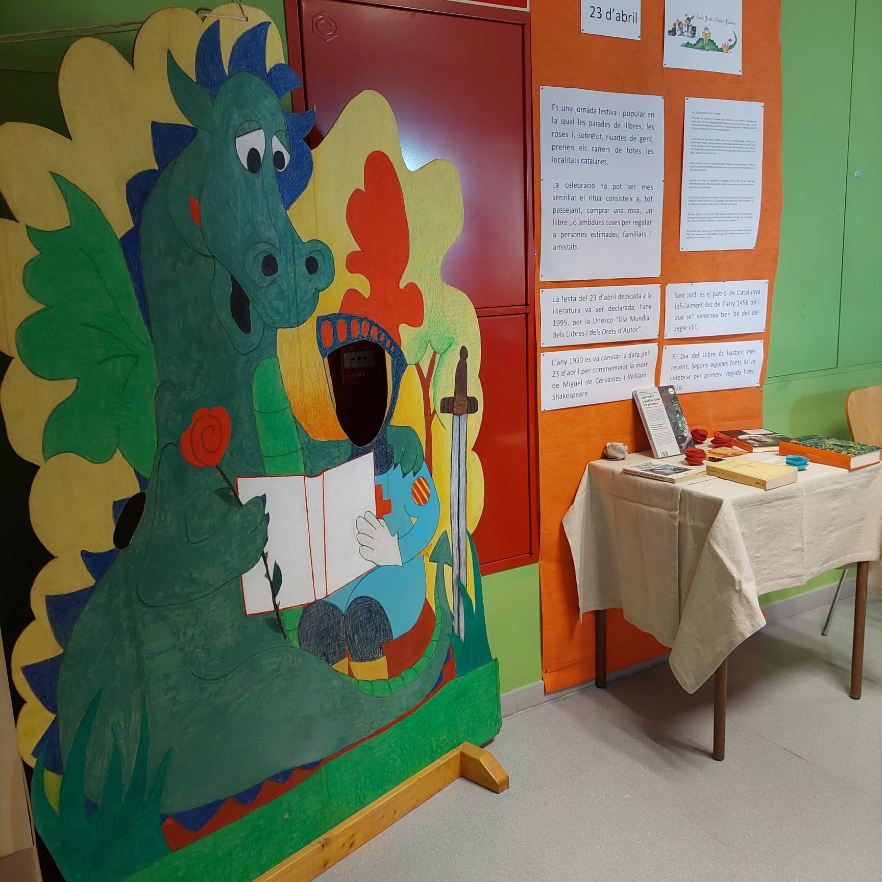 El nostre drac particular ha fet companyia al passallibres i s'ha deixat amanyagar per l'alumnat dels cursos quan sortien de l'aula que també podien llegir la història de la celebració i la llegenda de Sant Jordi.