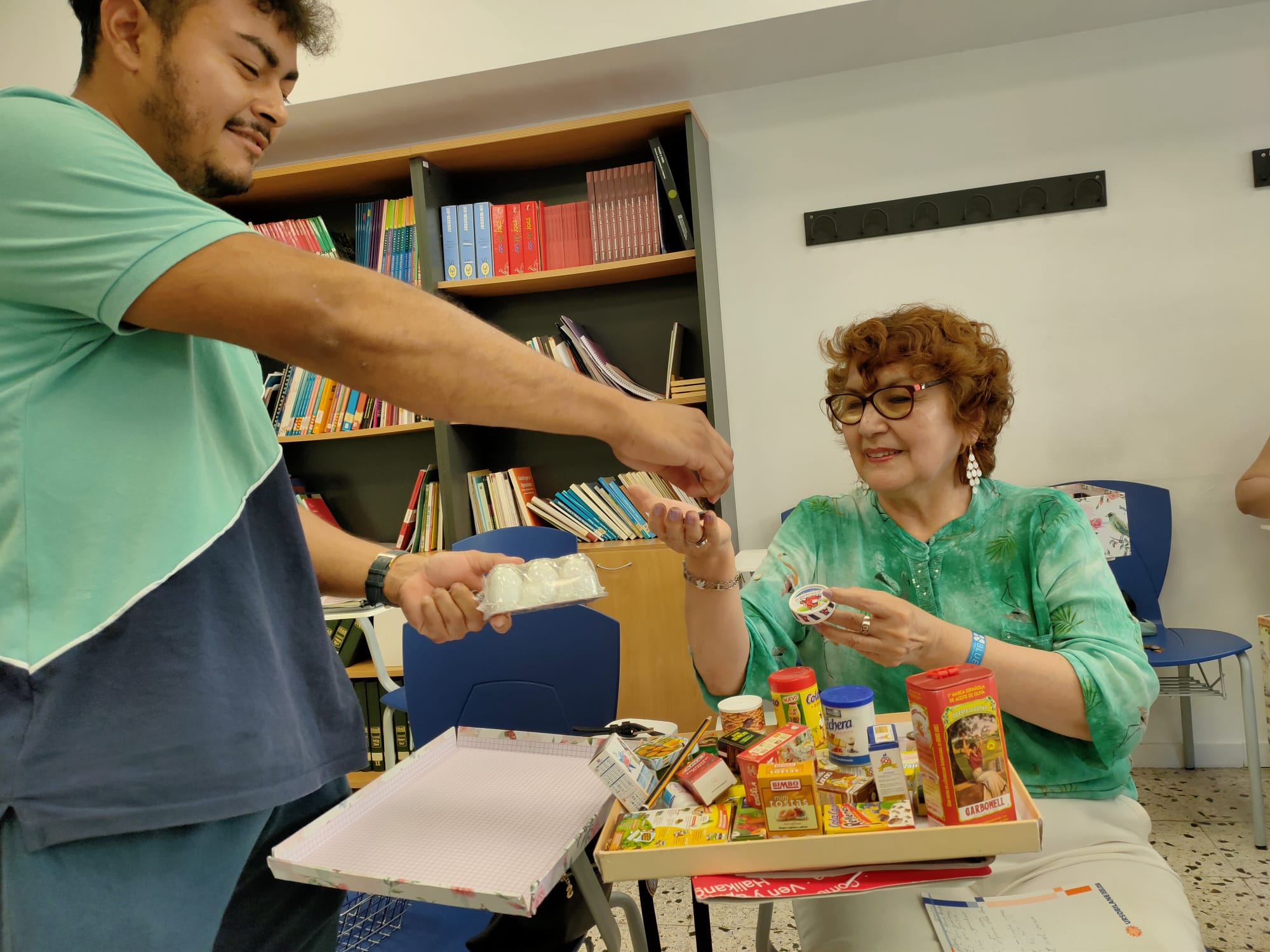 Com a part de l'estudi del vocabulari i la fraseologia dels aliments i d’anar a comprar, vam fer una activitat per posar en pràctica el que s’havia après a classe: la meitat dels alumnes van fer de botiguers i l'altra meitat, de clients. Tots van poder omplir la cistella després d'una intensa tarda d’anar a comprar!