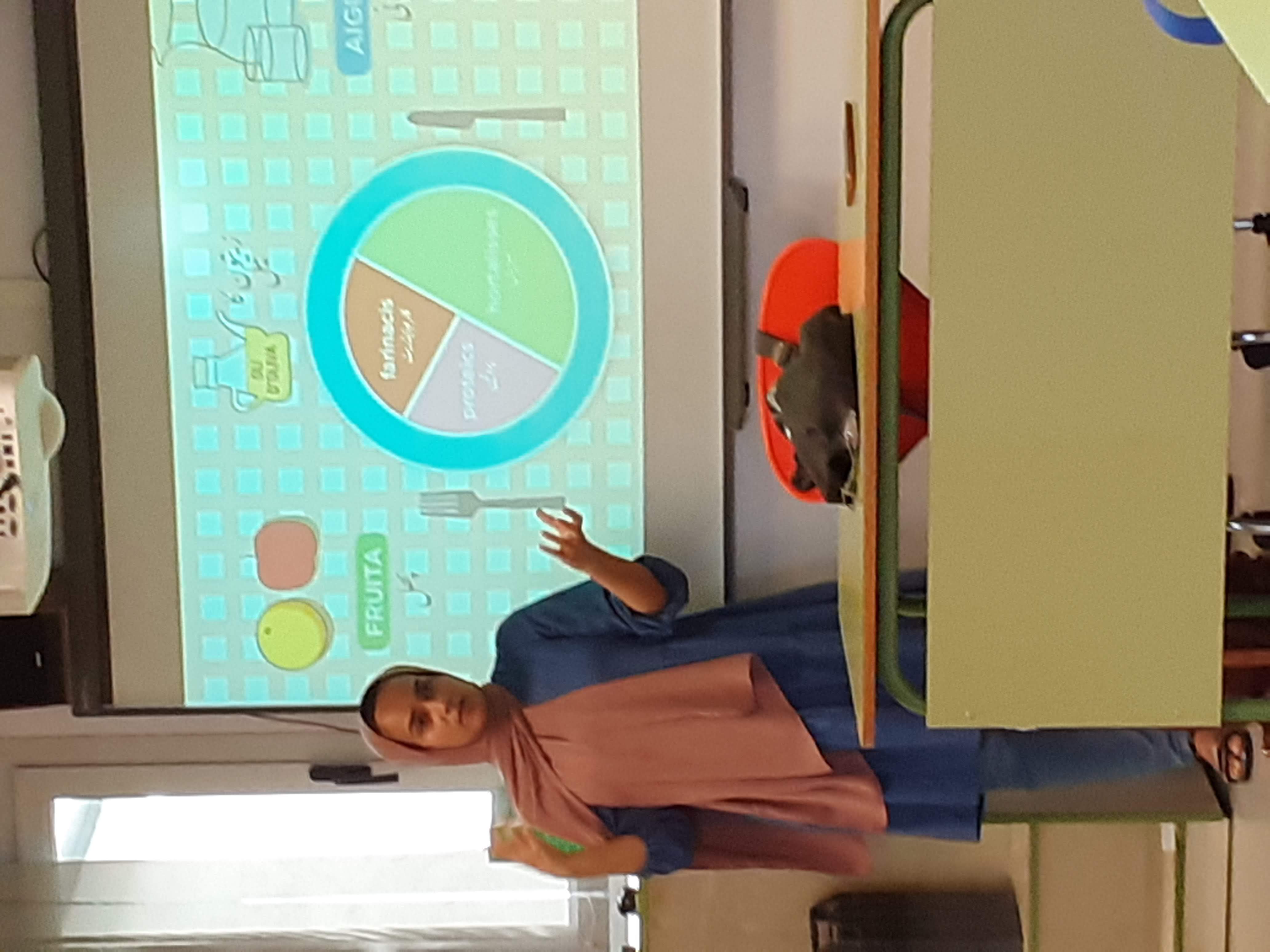 La Saba va fer una presentació sobre els hàbits saludables en l'alimentació, va explicar com hauria de ser un plat saludable a l'alumnat i seguidament va convidar a tothom a dissenyar un plat saludable seguint les seves indicacions: la meitat del plat hauria de ser d'hortalisses, una quarta part, d'aliments proteics, i la darrera, d'aliments farinacis.