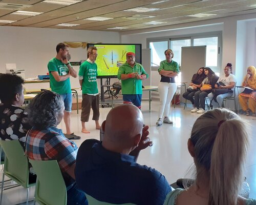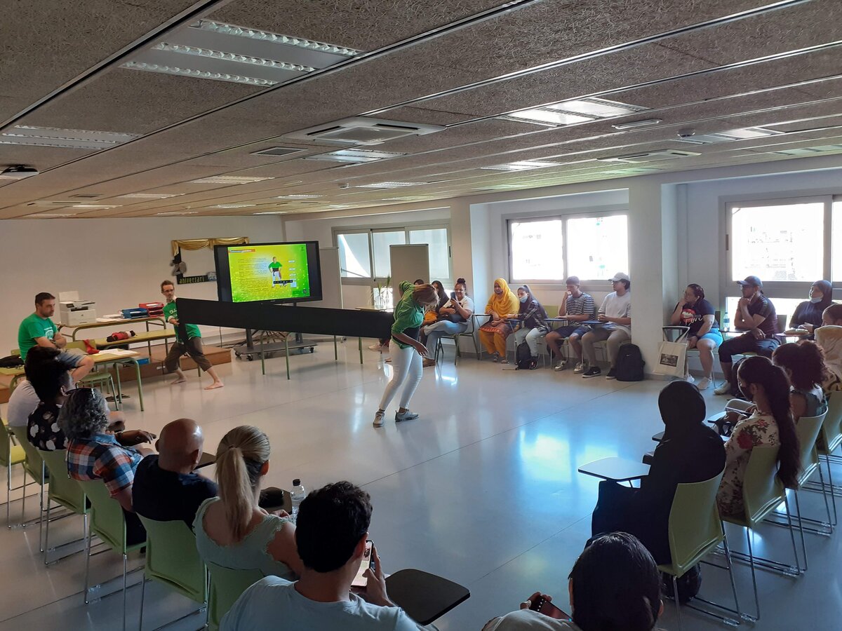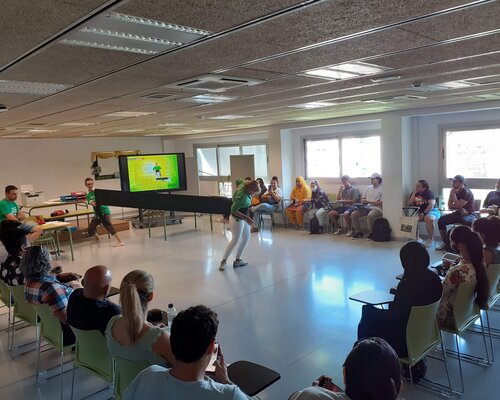 Quatre membres de la colla han presentat el món casteller: l'origen de la tradició, la vestimenta, els instruments musicals i també els diferents tipus de castells i les formes que tenen. Han mostrat com es posa una faixa i diferents posicions que adopten les persones que formen part de la pinya per ajudar a suportar tot el pes del castell.