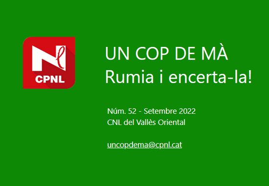 Trobareu tots els números d'Un cop de mà. Rumia i encerta-la! aquí.Restem, com sempre, a la vostra disposició per respondre qualsevol pregunta o consulta que ens vulgueu formular i us animem a fer-nos arribar (uncopdema(ELIMINAR)@cpnl.cat) idees o suggeriments que procurarem incloure en noves edicions.