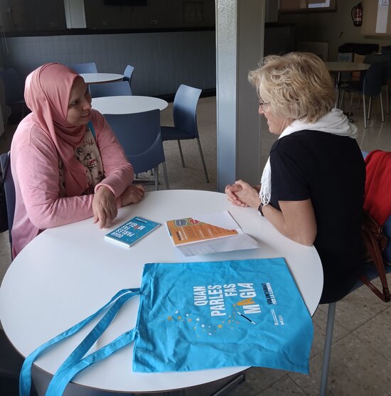 La Latifa aprèn català d'ençà que va arribar a Ripoll, ara fa vuit mesos. De seguida va tenir clar que si volia treballar i ajudar els seus fills a l'escola, li caldria tenir un bon nivell de llengua. És una dona inquieta culturalment, que al Marroc havia fet de mestra de francès. La Pilar és de Ripoll i l'ajuda a millorar l'oral. Queden un cop per setmana al centre cívic per parlar. És una experiència positiva per a totes dues, perquè, a més de fer conversa, la Latifa fa un aprenentatge de l'entorn i de la vida del poble, mentre que la Pilar se sent recompensada per l'esforç de l'aprenenta de conèixer la llengua i les activitats de la vila. En definitiva, amb el VxL tothom hi guanya.