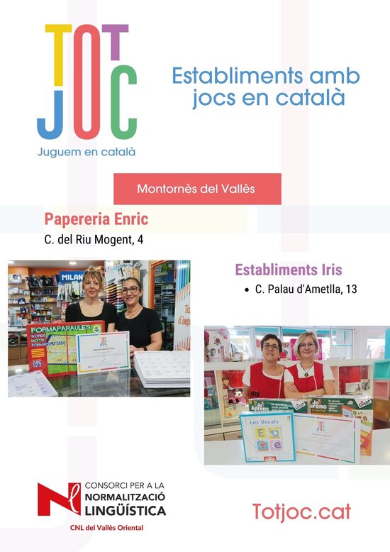 A Montornès tant la Papereria Enric com els Establiment Iris fa anys que se sumen a la campanya de difusió de jocs en català. Abans aquesta campanya s’anomenava “I tu, jugues en català”, però des de fa uns mesos duu el nom de TOT JOC.