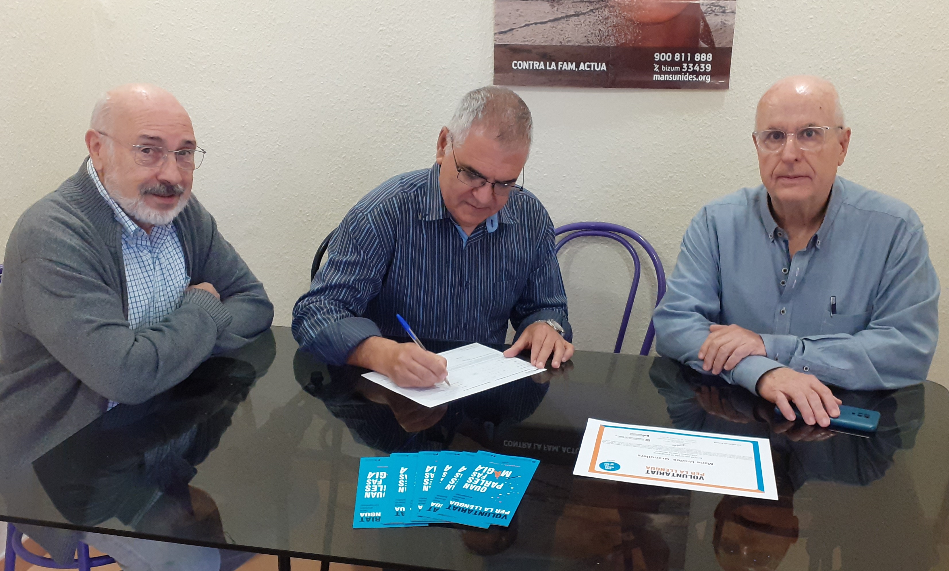 A la foto, José Latorre (tresorer), Joan Quintana (responsable de l’entitat) i Albert Preckler (àmbit de comunicació) durant la signatura de l'adhesió al Voluntariat per la llengua: