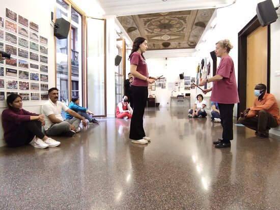 La jornada ha començat amb una visita guiada a mans de Montserrat Garrich i Mar Lleras de l'Esbart Català de Dansaires per la imatgeria popular del districte. Primer hem recorregut l'exposició dels gegants, capgrossos i bèsties dels diferents barris. Seguidament, hem pujat a la sala d'actes per aprendre alguns dels balls tradicionals com les corrandes o la bolangera i finalment hem après algunes posicions del ball de bastons.