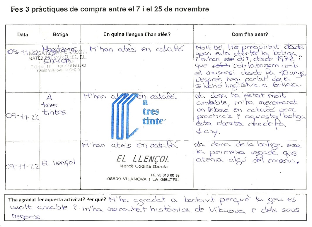 Gràcies a la complicitat de la xarxa d'establiments col·laboradors -compromesos a fer la primera atenció als clients en català i a mantenir aquesta llengua amb els nous parlants de català-, els aprenents del Servei de Català del Garraf i Vilanova i la Geltrú i de l'Escola d'Adults Teresa Mañé van posar en pràctica els seus coneixements de català fora de l'aula. Cal remarcar que aquest any s'ha recuperat la participació dels alumnes de l'Escola d'Adults Teresa Mañé en aquesta pràctica del català fora de l'aula, que s'havia estroncat per la pandèmia.