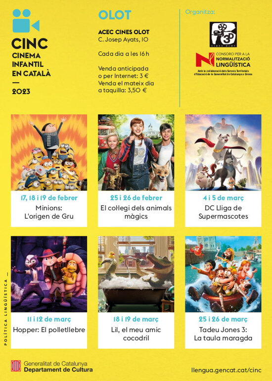 El divendres 17 de febrer va començar, a Olot, el cicle CINC de cinema infantil en català. Es projectaran 6 pel·lícules, una cada cap de setmana, fins al 26 de març.