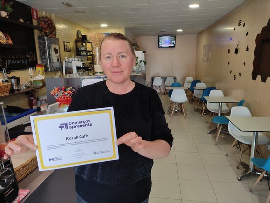 L’Oksana fa anys que viu a Granollers i ara és ella que ajuda persones arribades d’Ucraïna. És així com la Viktoriya, amiga seva, també es va afegir a les sessions i ara s’ha inscrit a un curs Bàsic 1 de català. Per l’Oksana els aspectes lingüístics i culturals són molt valuosos i donar un bon servei i respectar i conèixer la cultura del lloc on viu és prioritari. Als clients que parlen català els fa saber que el vol aprendre més i els anima a parlar-li en aquesta llengua, tot mostrant-los el diploma i el distintiu del programa.