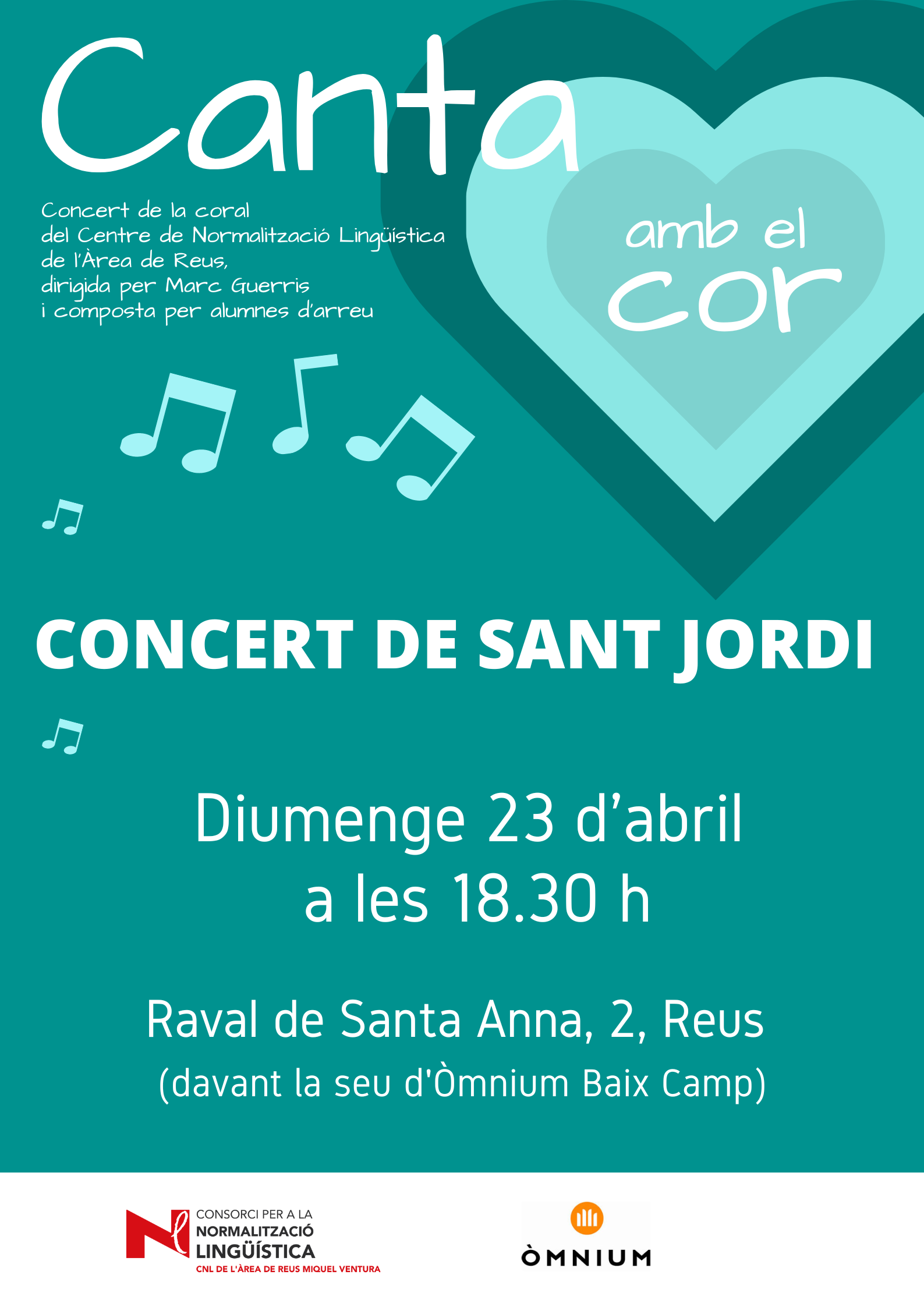 El dia de Sant Jordi el CNL oferirà al públic en general un petit concert de la coral Canta amb el cor, dirigida per Marc Guerris. La coral del CNL està integrada per persones que parlen català i altres que l'estan aprenent. L'actuació serà a les 18.30 h al raval de Santa Anna, 2, de Reus, davant la parada i la seu d'Òmnium Baix Camp.