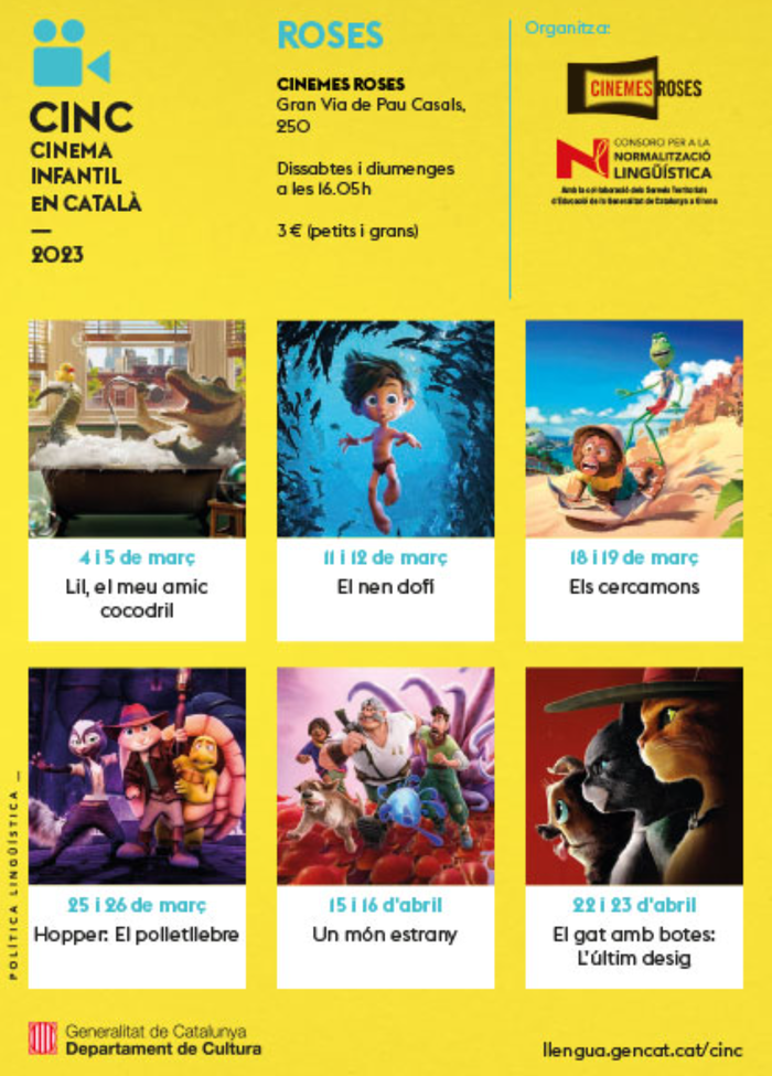 Entre el 4 de març i el 23 d'abril, s'han projectat les pel·lícules següents als Cinemes Roses: Lil, el meu amic el cocodril (4 i 5 de març), El nen dofí (11 i 12 de març), Els cercamons (18 i19 de març), Hopper: el polletllebre (25 i 26 de març), Un món estrany (15 i 16 d'abril) i El gat amb botes: l'últim desig (22 i 23 d'abril).