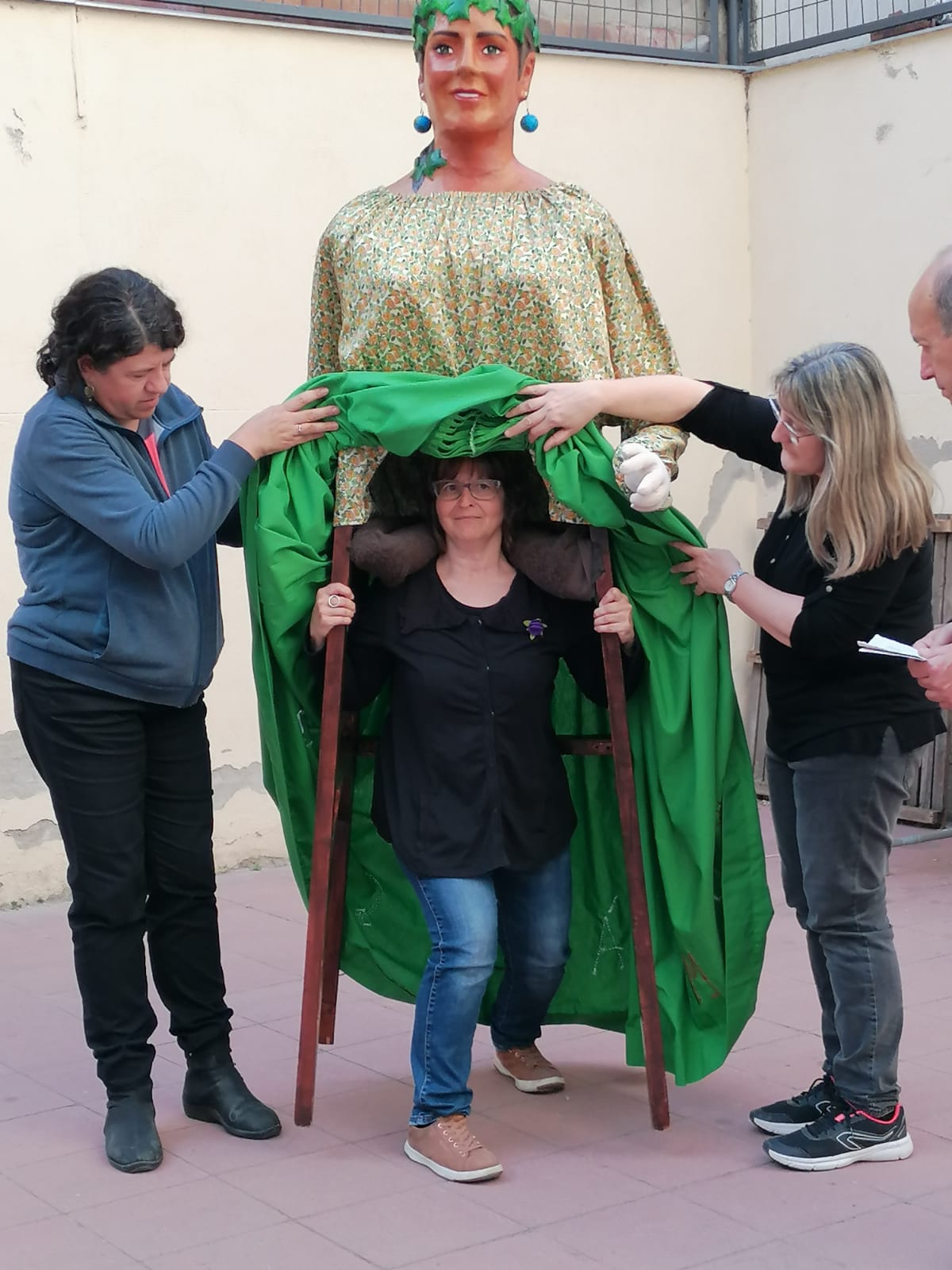 A més, l'equip de cosidores del Hilo del Casal i la modista, Sílvia Sintes van acabar els últims retocs del vestit. Com que a la gegantona li agrada molt la natura, l'equip de costura ha escollit uns motius florals per a la brusa i un to verd viu per a la faldilla. I com que també estudia el català li han brodat lletres a la faldilla, com per exemple la l·l o la ç.