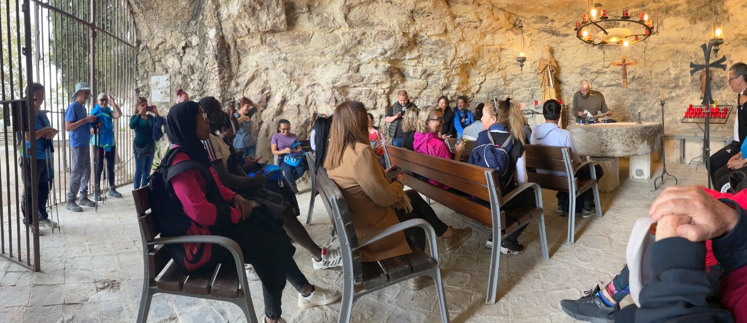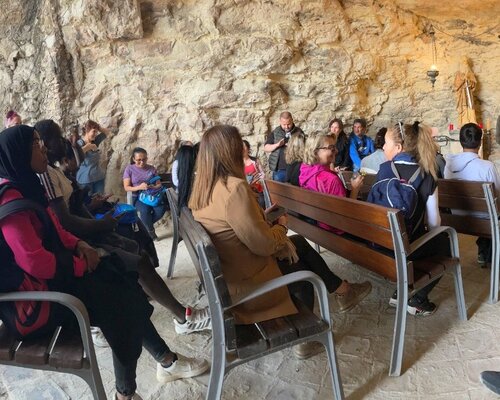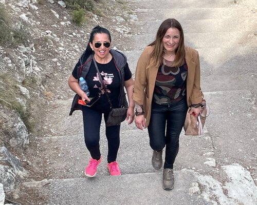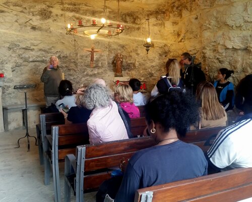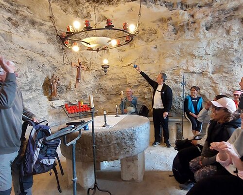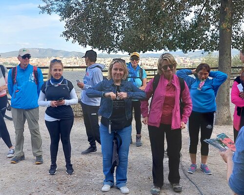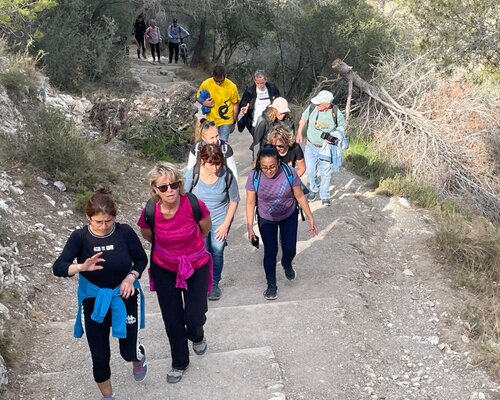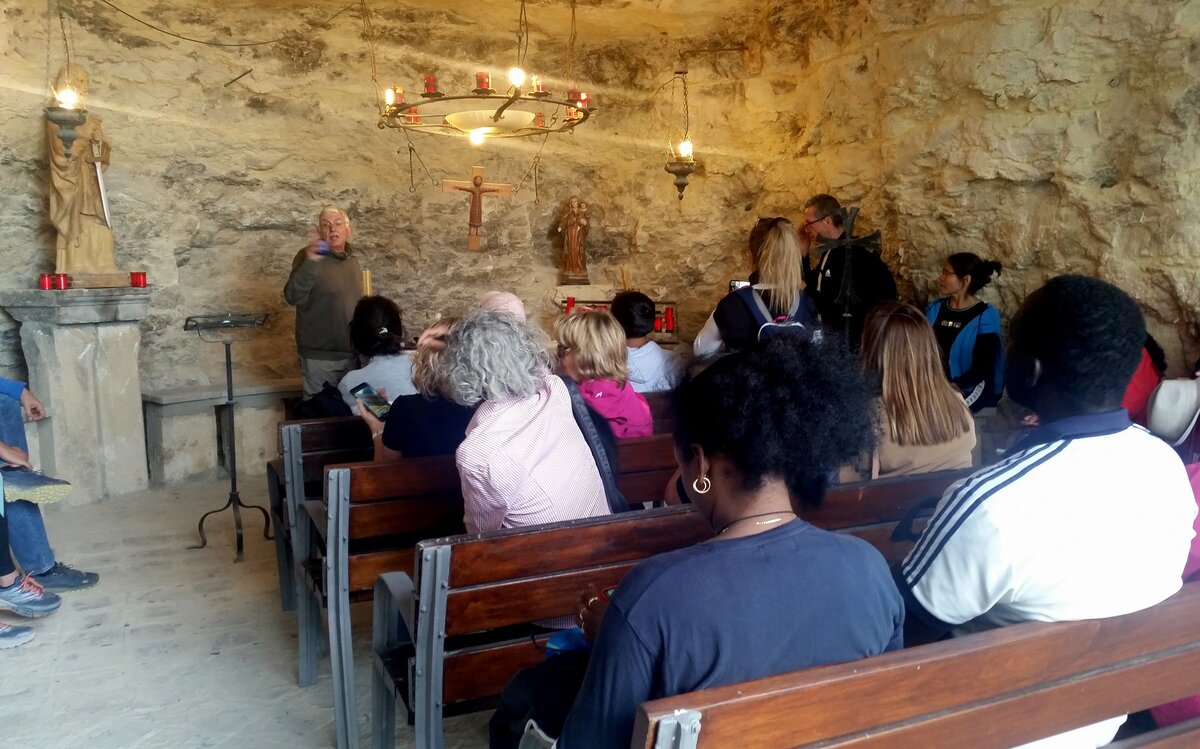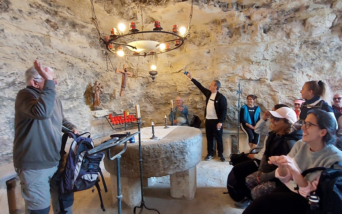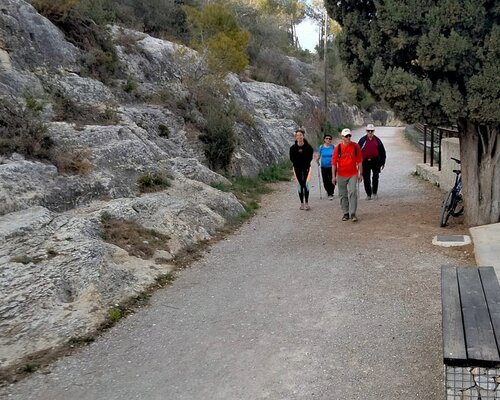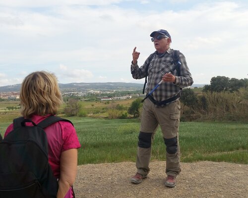 La primera parada, que també va servir per reagrupar els excursionistes, es va fer a la zona d'esbarjo de la muntanya de Sant Jaume, una de les zones lúdiques més antigues de Vilafranca. La parada següent ja va ser a l'ermita de Sant Pau. Després de contemplar el magnífic paisatge i la vista de la ciutat des del mirador, en Joaquim va explicar d'una manera clara i senzilla la història dels primers pobladors de Vilafranca, d'on procedien, el significat de la paraula... Seguidament el grup va entrar a l'ermita de Sant Pau, excavada dins la pedra, amb més de sis-cents anys d'història, per seguir les explicacions del guia.