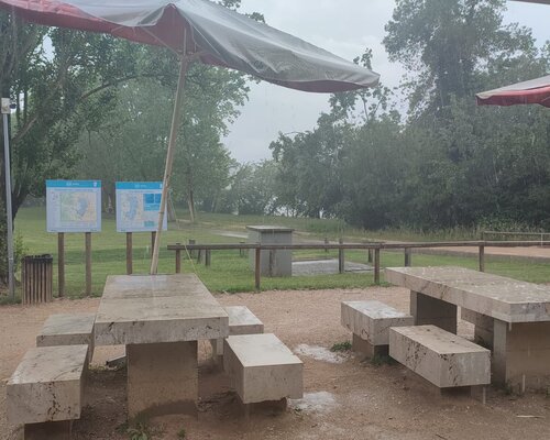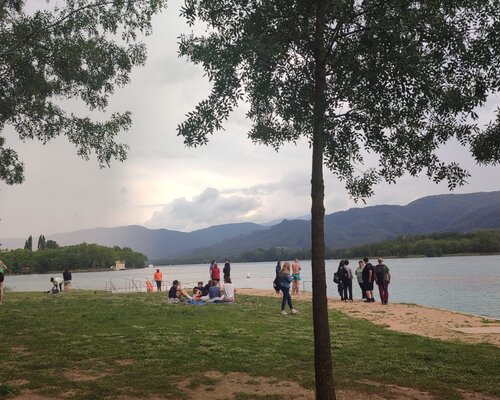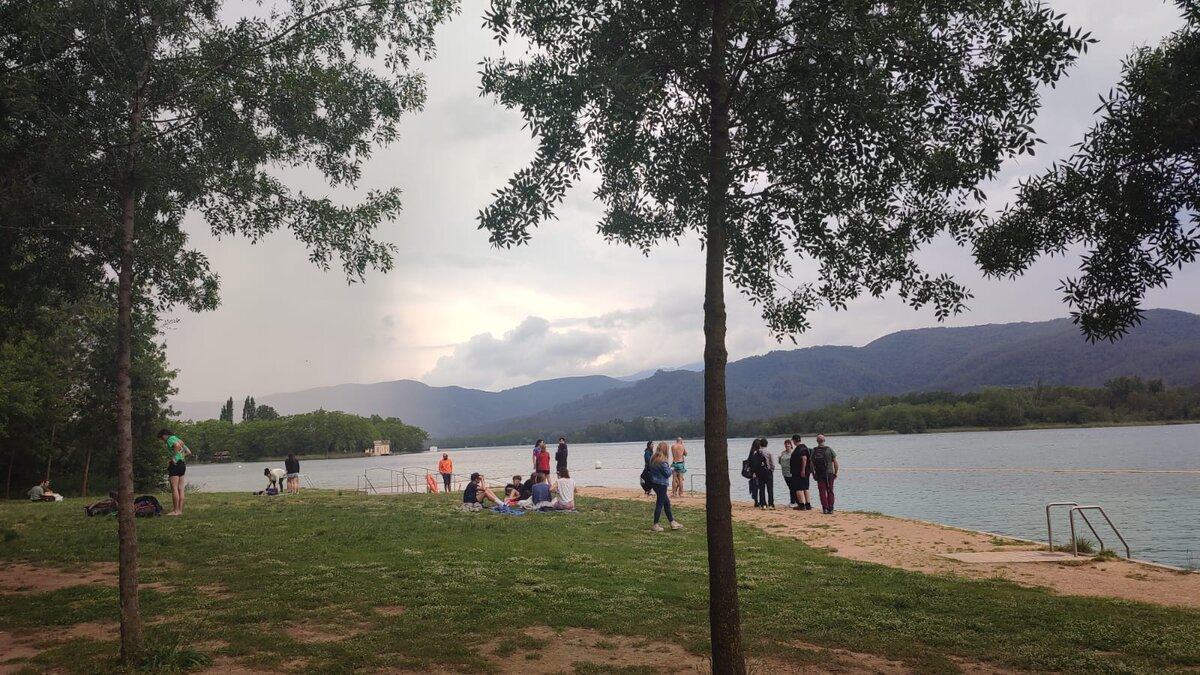 La parada a l'estany de Banyoles va ser passada per aigua, ja que caigué un ruixat que obligà a tothom a treure paraigües i impermeables. El dinar fou tan ràpid com el xàfec. Tornà a sortir el sol i la sortida continuà sense cap més entrebanc.