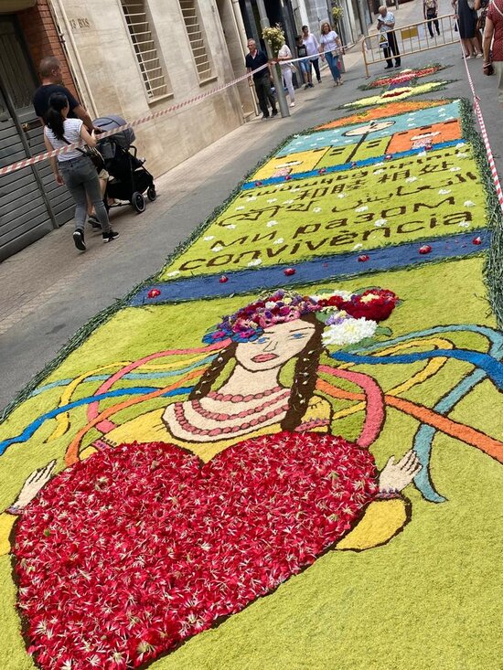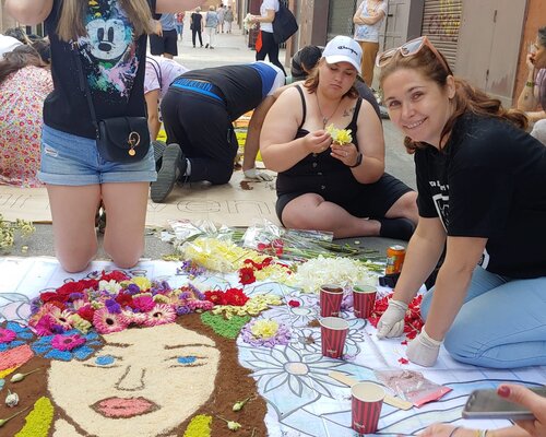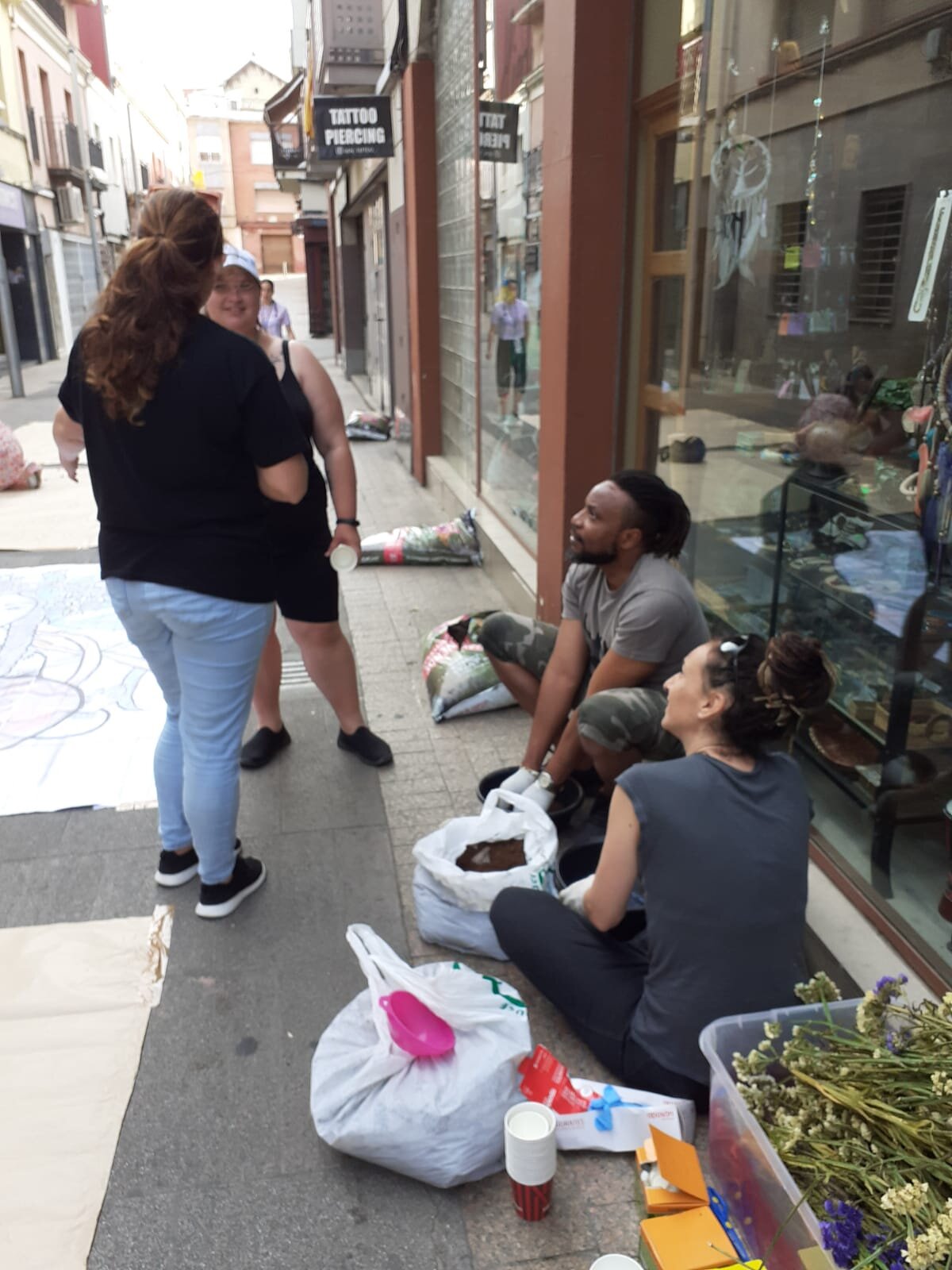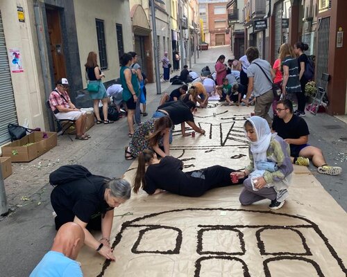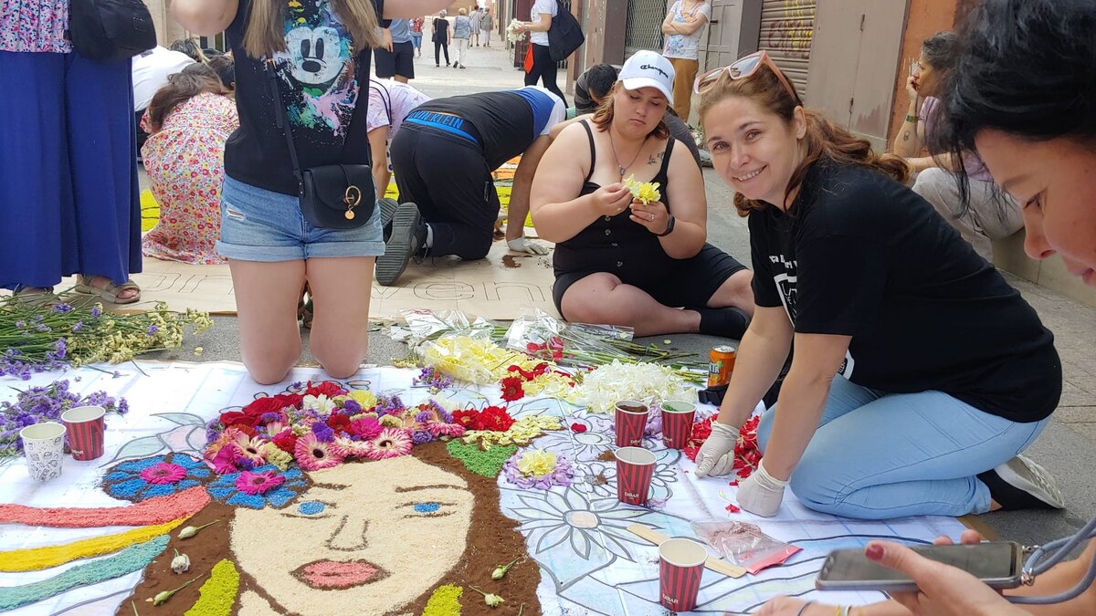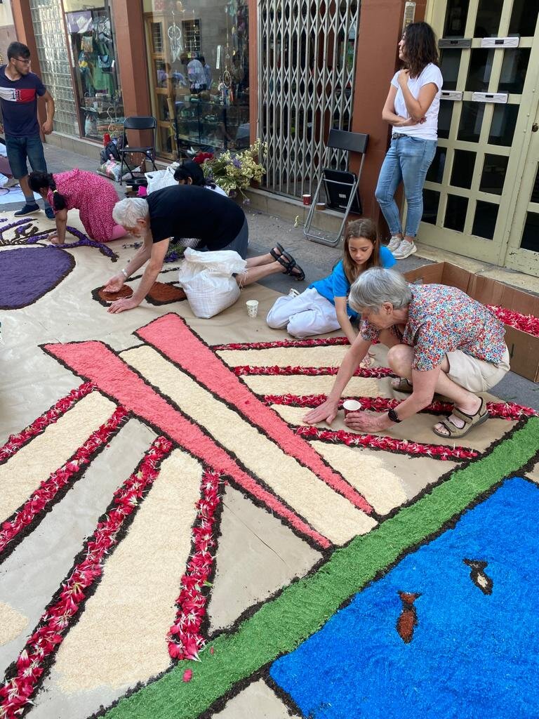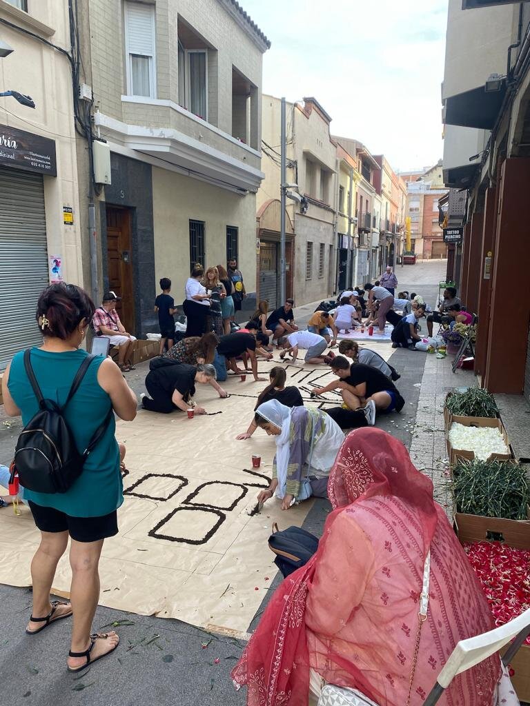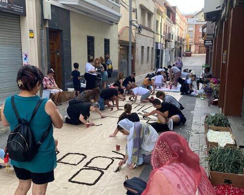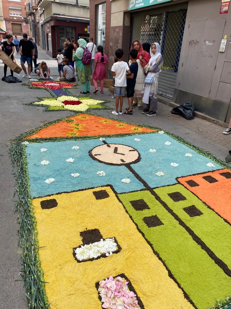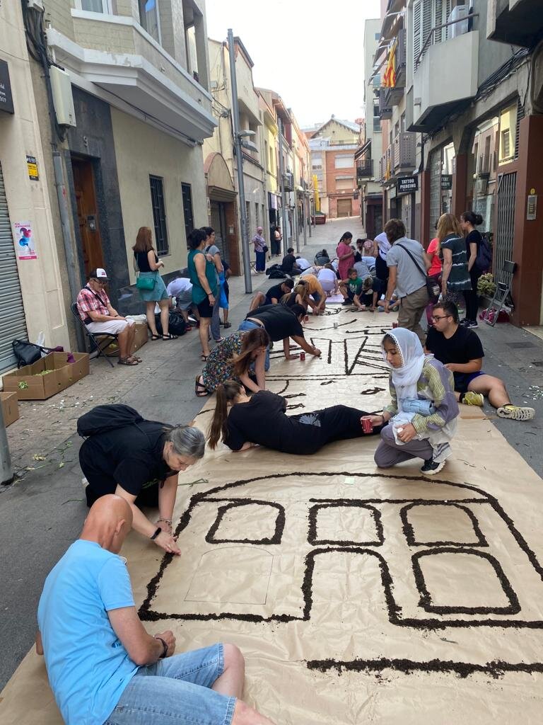 De la mateixa manera es van fer la resta de catifes dels altres districtes, en d'altres carrers. A les 19 h de la tarda el cercavila amb els gegants i els músics van ballar per sobre d'aquest art efímer tan arrelat a la cultura catalana i que és fruit d'un treball col·laboratiu i molt participatiu.