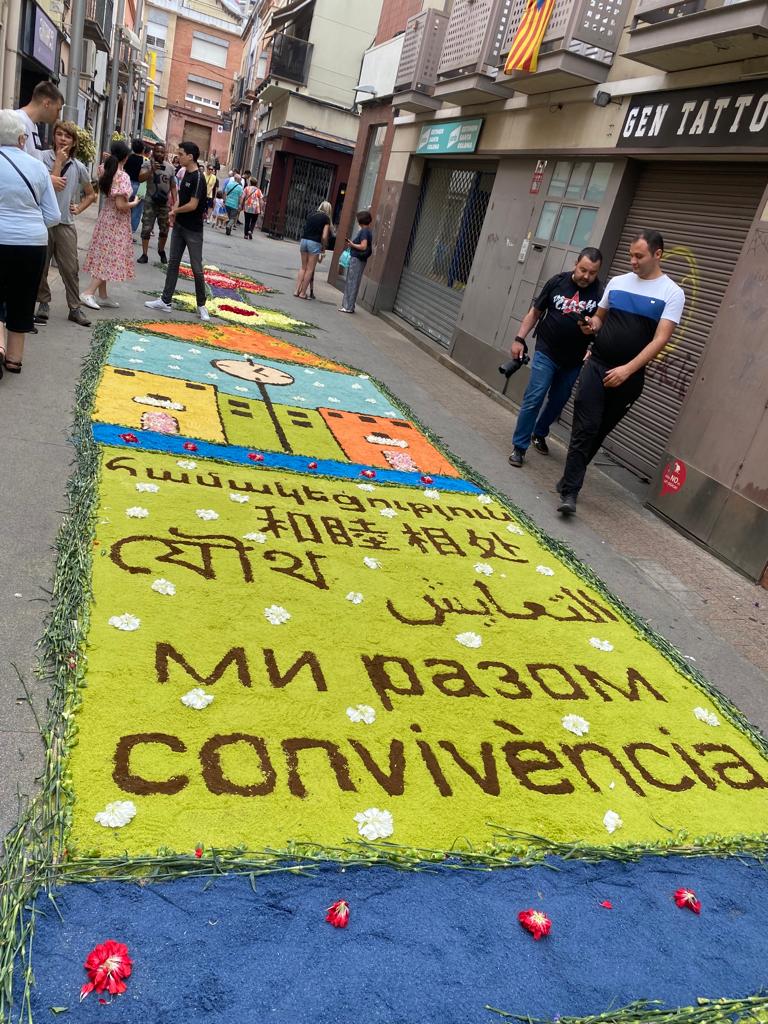 A les nostres catifes al carrer Josep Anselm Clavé s'hi podia veure el rellotge de la plaça del Rellotge i els edificis de color groc, verd i taronja del barri del Fondo de la part de dalt. També s'hi podia llegir la paraula convivència en sis llengües molt presents al barri: l'armeni, el xinès, el bengalí, l'ucraïnès i l'àrab, a més del català. El grup de dones d'Ucraïna hi van dibuixar una dona amb un vestit tradicional i amb un gran cor. Seguidament, representant el Raval, hi havia el cor del parc del Motocross, el pont de Can Peixauet i el riu ple de peixos, i finalment, una gran casa que representa el Casal dels Infants.