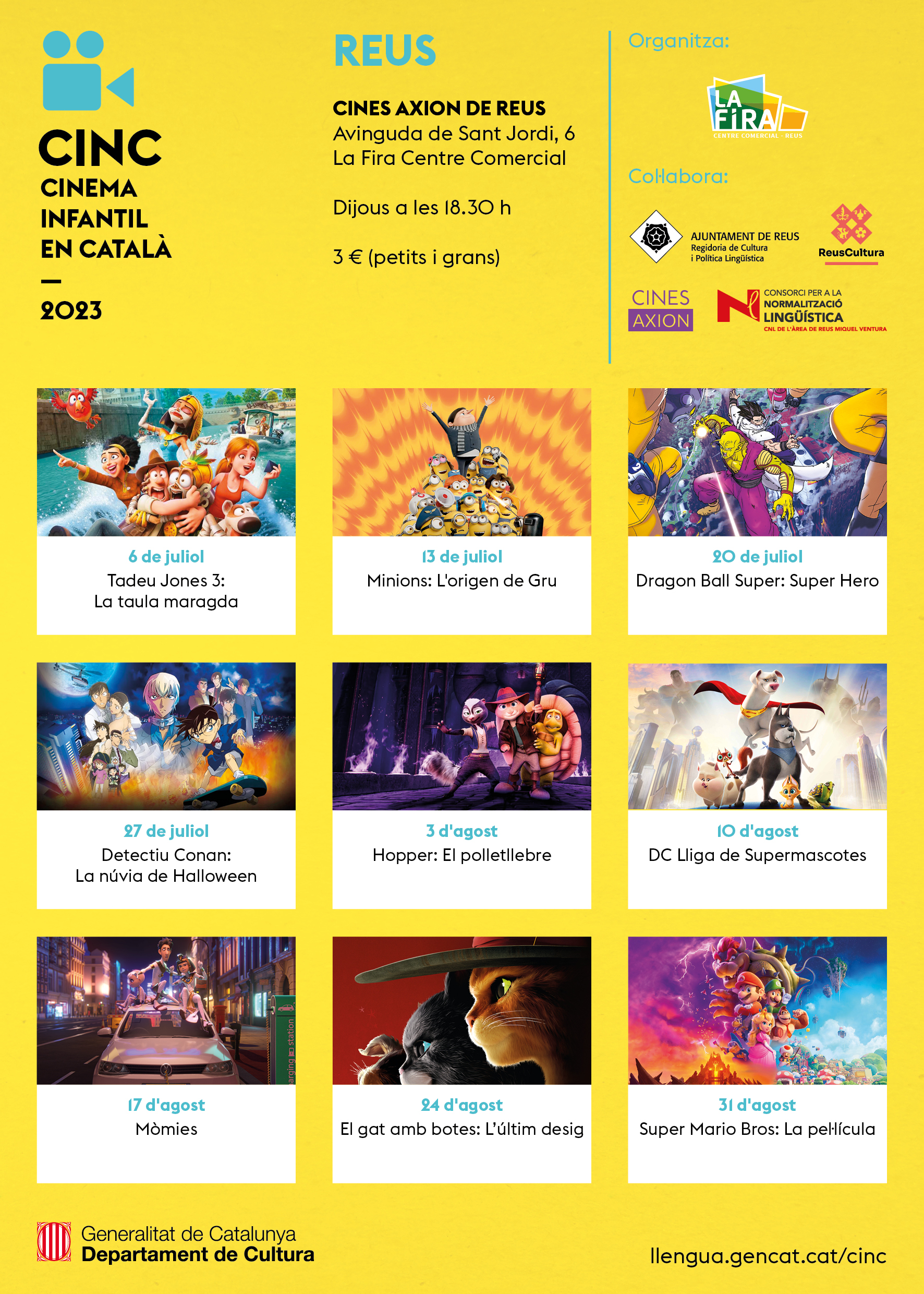 El Cicle de Cinema Infantil en Català continua aquest agost amb èxit a Reus de la mà de La Fira Centre Comercial, la Regidoria de Política Lingüística de l'Ajuntament de Reus, el Centre de Normalització Lingüística de l'Àrea de Reus i els Cines Axion.