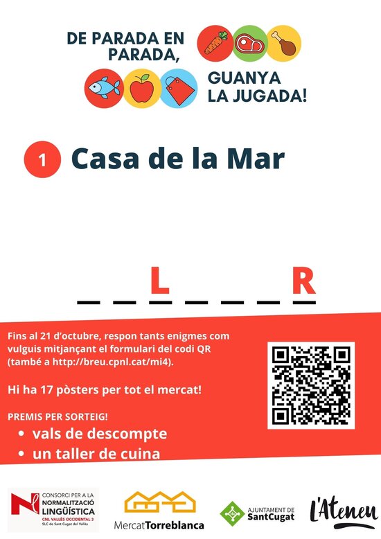 Si aneu als mercats de Torreblanca de Sant Cugat, Serraperera o Fontetes de Cerdanyola, busqueu els cartells amb diferents enigmes i responeu-ne tants com vulgueu mitjançant el formulari (Sant Cugat i Cerdanyola) a què us adreça el codi QR dels cartells.