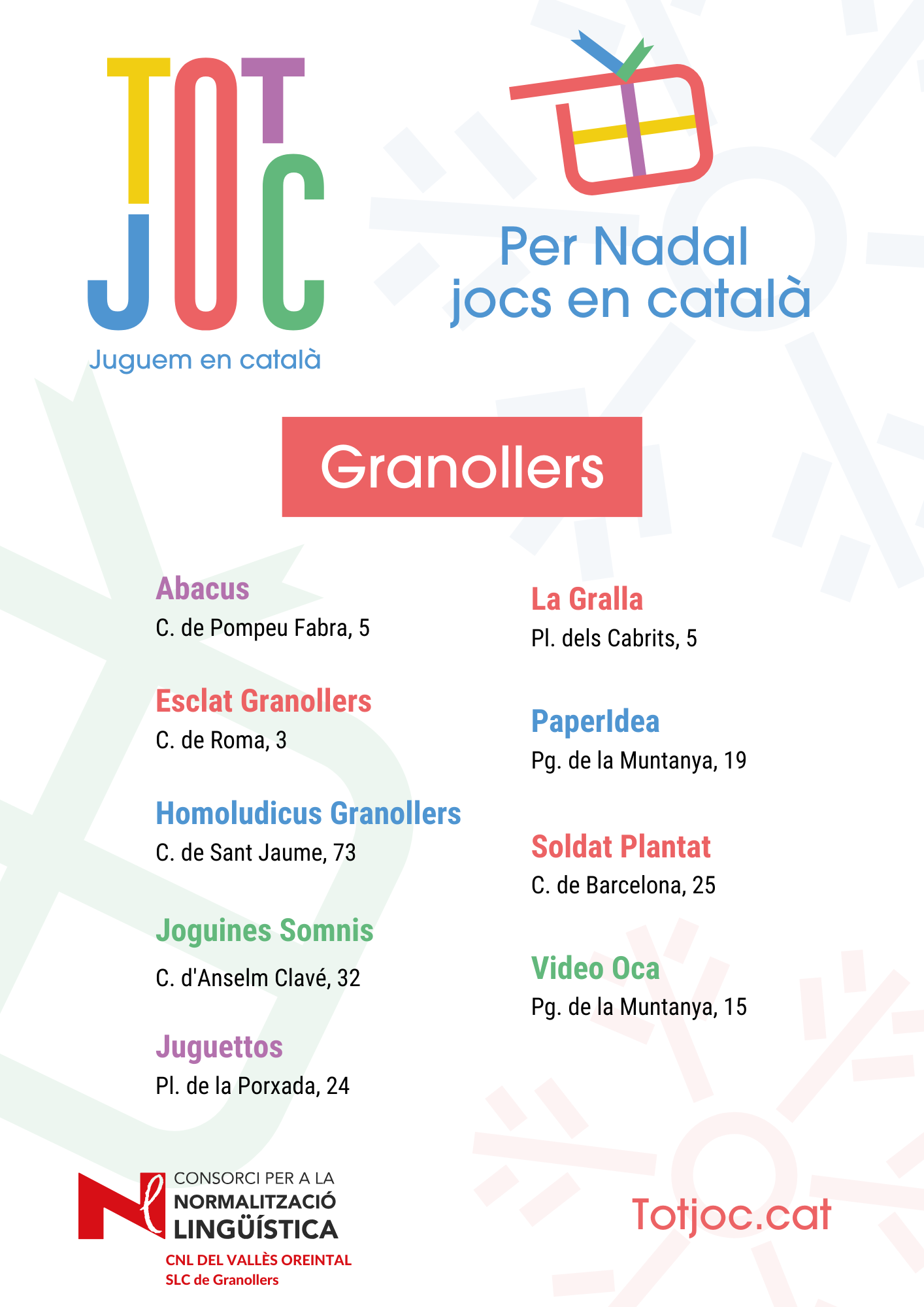 El supermercat Esclat Granollers, que forma part del Grup Bonpreu i Esclat, s’ha adherit a la campanya Totjoc. Juntament amb la resta d’establiments col·laboradors de Granollers, fan que a la ciutat hi hagi una oferta ben completa d’aquest producte educatiu i d’oci en català.