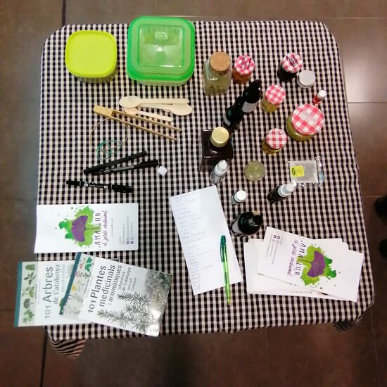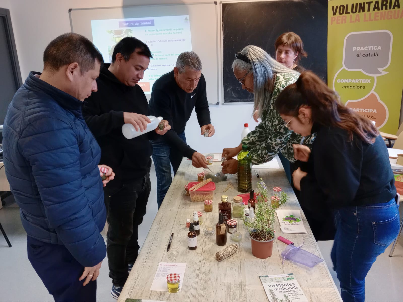 A continuació, va ensenyar imatges de plantes medicinals per parlar del seu nom, els seus usos, les elaboracions i els processos. Van sorgir conceptes com ara: tisana, decocció, maceració, xarop, vins vegetals, suc fresc, oleat, ungüent o destil·lació. La part final del taller va consistir a elaborar una tintura de romaní per part de l'alumnat. Aquest remei natural s'utilitza per via tòpica i és ideal per a dolors musculars i per a la circulació de les cames.