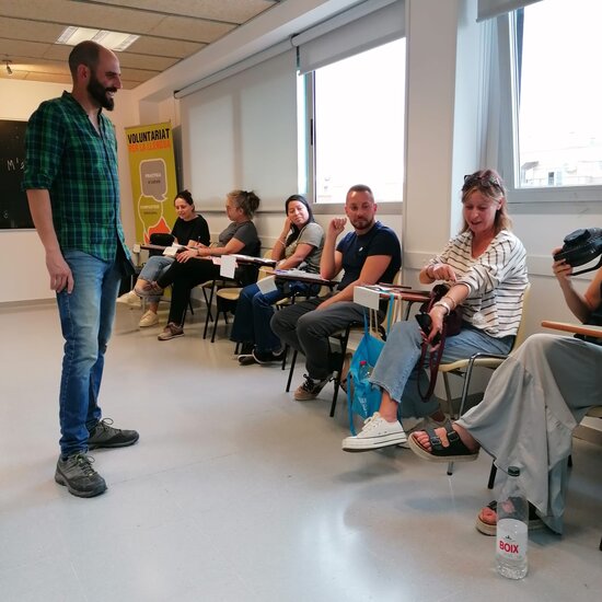 Què és una ruta GR, una PR o un SL? Més tard el Luis ha posat a prova els assistents d'una manera lúdica i els ha demanat agafar els seus mòbils per descobrir la gran quantitat de rutes que envolten Santa Coloma i que arriben, fins i tot, a Santiago de Compostel·la.