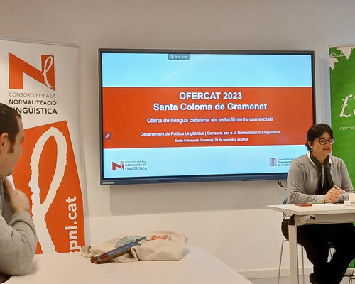 Blanca Padrós, segona tinenta d'alcaldessa de l'Àrea de Famílies i Drets Socials i presidenta del Consell de Centre del CNL L'Heura, i Vanessa Bretxa, tècnica d'estudis i indicadors del Departament de Política Lingüística de la Generalitat de Catalunya han presentat l'acte i els resultats de l'estudi Ofercat 2023 i el pla Ofercat 2024-2028 a Santa Coloma de Gramenet per promoure l'ús del català al comerç.