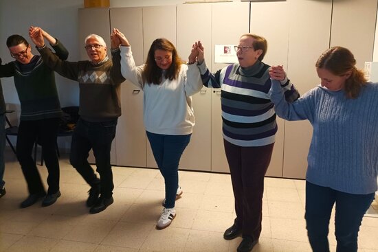 Encarna Gascón, llevadora jubilada, voluntària lingüística i mestra de sardanes, fa tallers de sardanes gratuïts al Casal de Cultura a l'empara de l'associació Palau Dalmanla, entitat col·laboradora del Voluntariat per la llengua que vol dinamitzar activitats culturals al municipi.