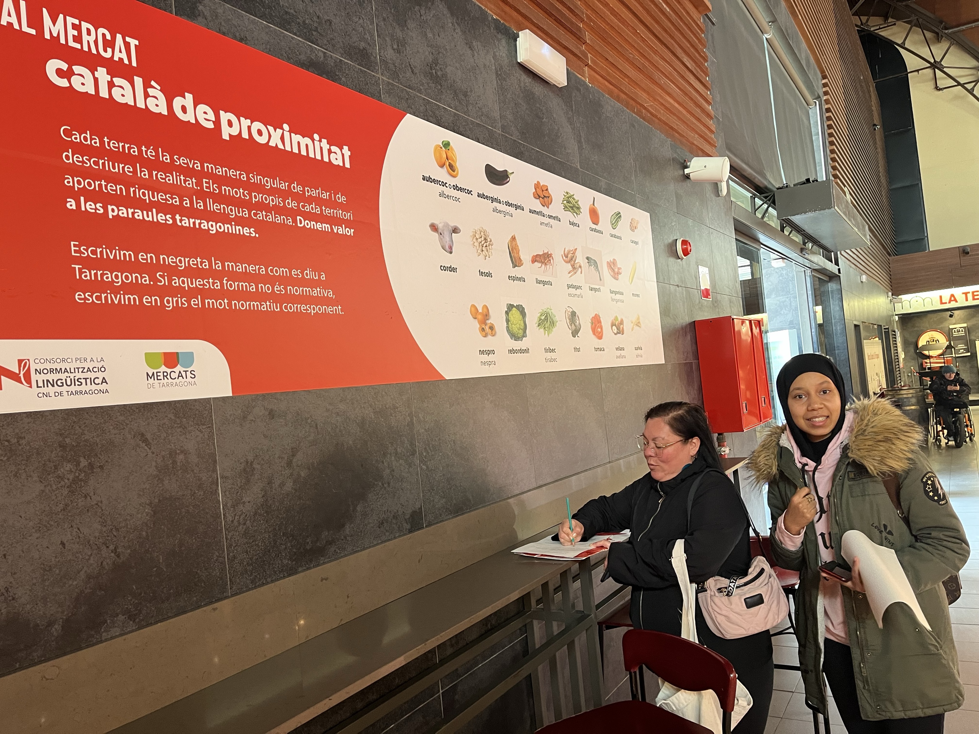 Finalment, 12 alumnes de curs Bàsic 2 de Tarragona van anar al Mercat Central. Van familiaritzar-se amb el vocabulari de l’alimentació amb el cartell Català de proximitat elaborat pel CNL i a través de les diferents parades del mercat. També van aprofitar els cartells per parlar del català de proximitat. La visita era la culminació d’un treball fet a classe sobre menjars típics catalans: esqueixada, faves a la catalana, suquet de peix... Els alumnes van haver de buscar on comprar els ingredients de cada plat, com demanar-los (a pes, a peces, a talls...) i com demanar-ne el preu.