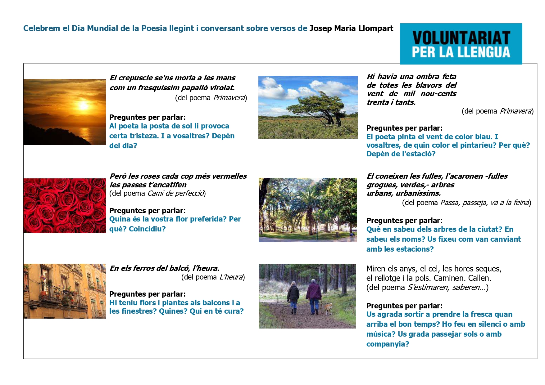 A partir d'alguns versos dels seus poemes s'han plantejat diverses preguntes que ajuden les parelles lingüístiques i els clubs de lectura a reflexionar sobre les respostes, a millorar la seva expressió oral i a compartir informacions i experiències personals que els permeten cohesionar-se.