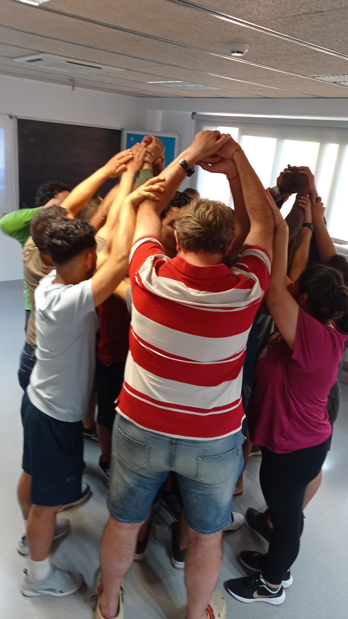 S'han posat la faixa per acabar fent una pinya i l'alumnat ha aprofitat el moment per fer-los preguntes, ja que l'objectiu és practicar el català.