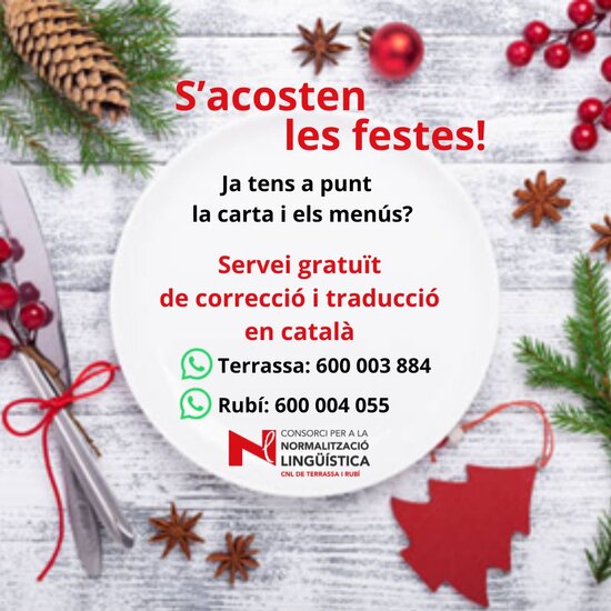 Amb l'arribada de les festes, el Servei d'Assessorament Lingüístic (SAL) del Centre de Normalització Lingüística de Terrassa i Rubí impulsa una campanya adreçada als establiments de restauració de Terrassa, Rubí, Matadepera, Viladecavalls, Vacarisses, Ullastrell i Rellinars per promoure l'ús del català en els menús de festes i menús per a grups.