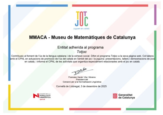 Aquesta setmana, el Museu de Matemàtiques de Catalunya (MMACA) ha renovat l'adhesió al programa Totjoc del Consorci per a la Normalització Lingüística, que difon i promociona el joc i la joguina en català. També continua formant part del Voluntariat per la llengua. Actualment, és una de les entitats cornellanenques que fa més anys que pertany als dos programes. Concretament, ha superat els deu anys des de la primera adhesió.