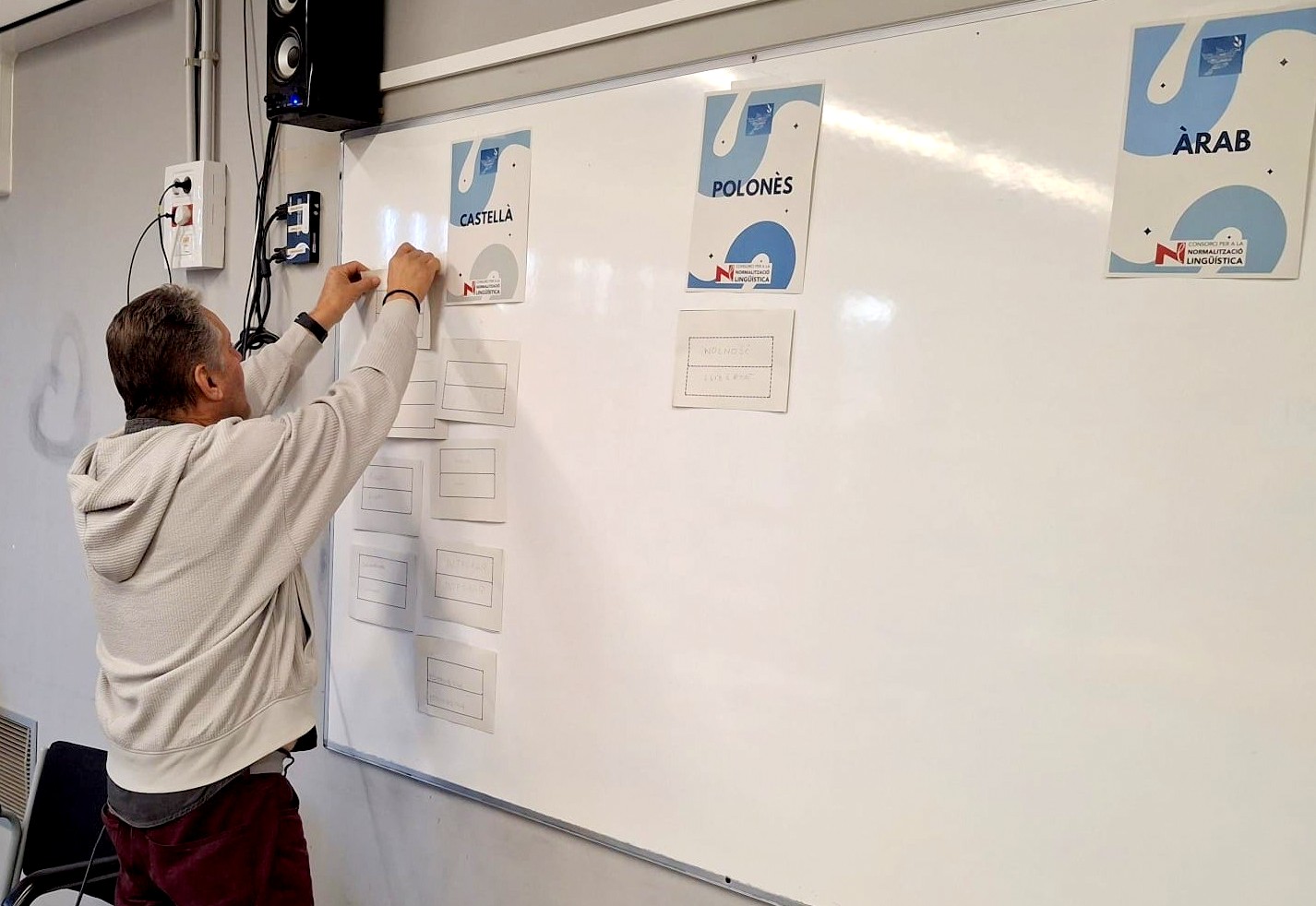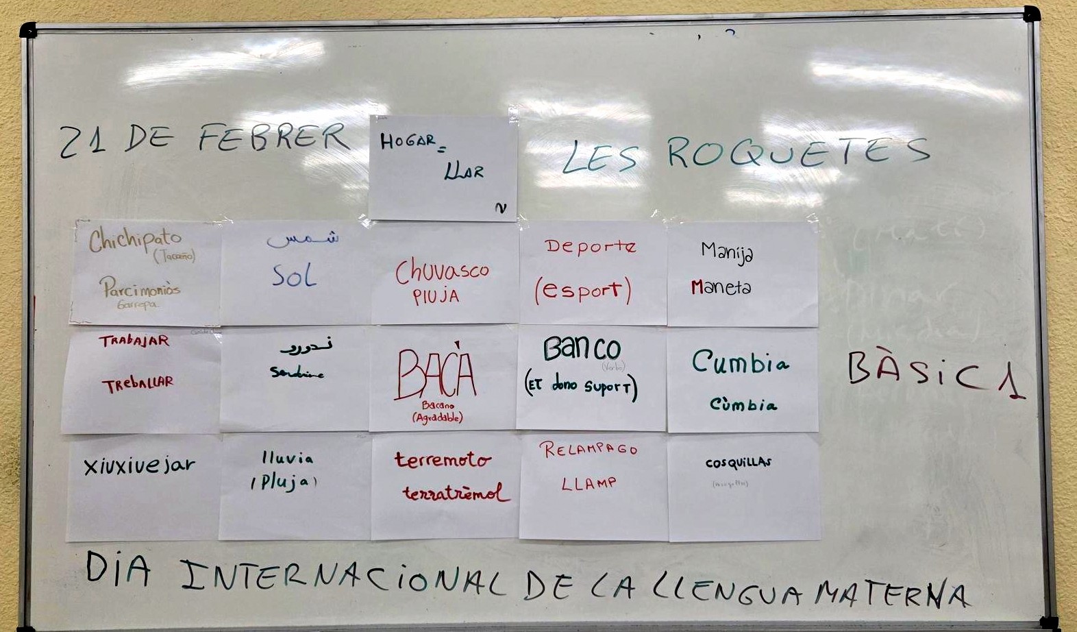 Una quinzena d'alumnes del Bàsic 1 de les Roquetes van escriure una paraula que els agradava en la seva llengua materna, la van traduir al català i la van penjar a la pissarra.