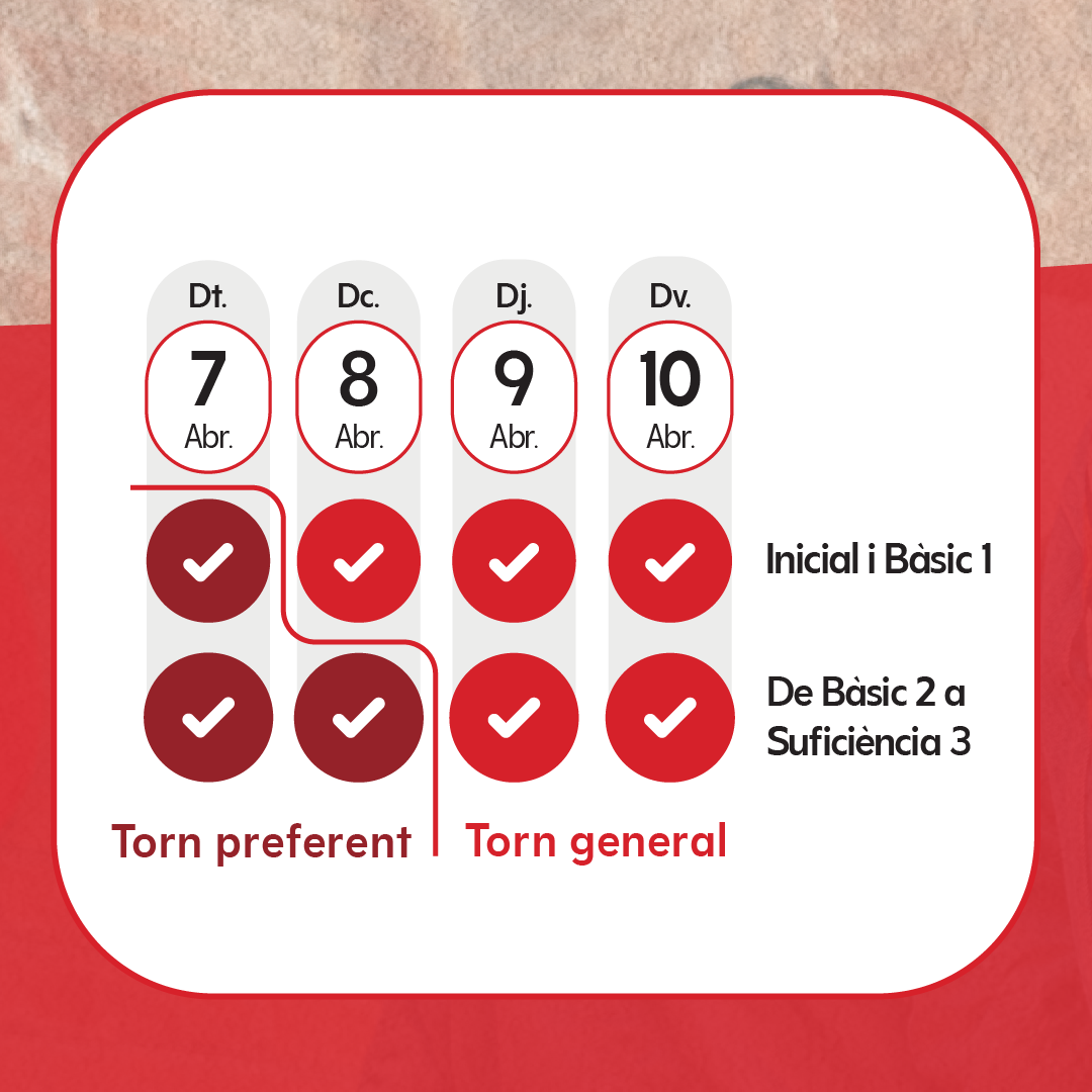 En concret, el dia 7 s'hi podran inscriure només els alumnes que han fet cursos els últims 12 mesos, el 8 d'abril serà la data reservada per a les persones que no han estat alumnes del Consorci per a la Normalització Lingüística i s'han d'iniciar amb l'aprenentatge de català amb un curs Inicial o Bàsic 1, i el dia 9 i 10 es podran matricular les persones que hagin de fer entre Bàsic 2 i Suficiència 3 i també les que ja tenien l'opció d'inscriure's els dies 7 i 8. Les places són limitades i s'atorgaran per ordre d'arribada.