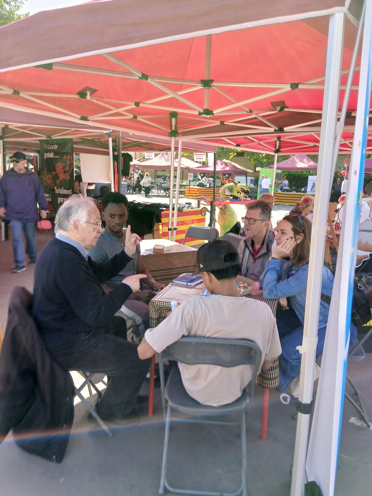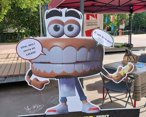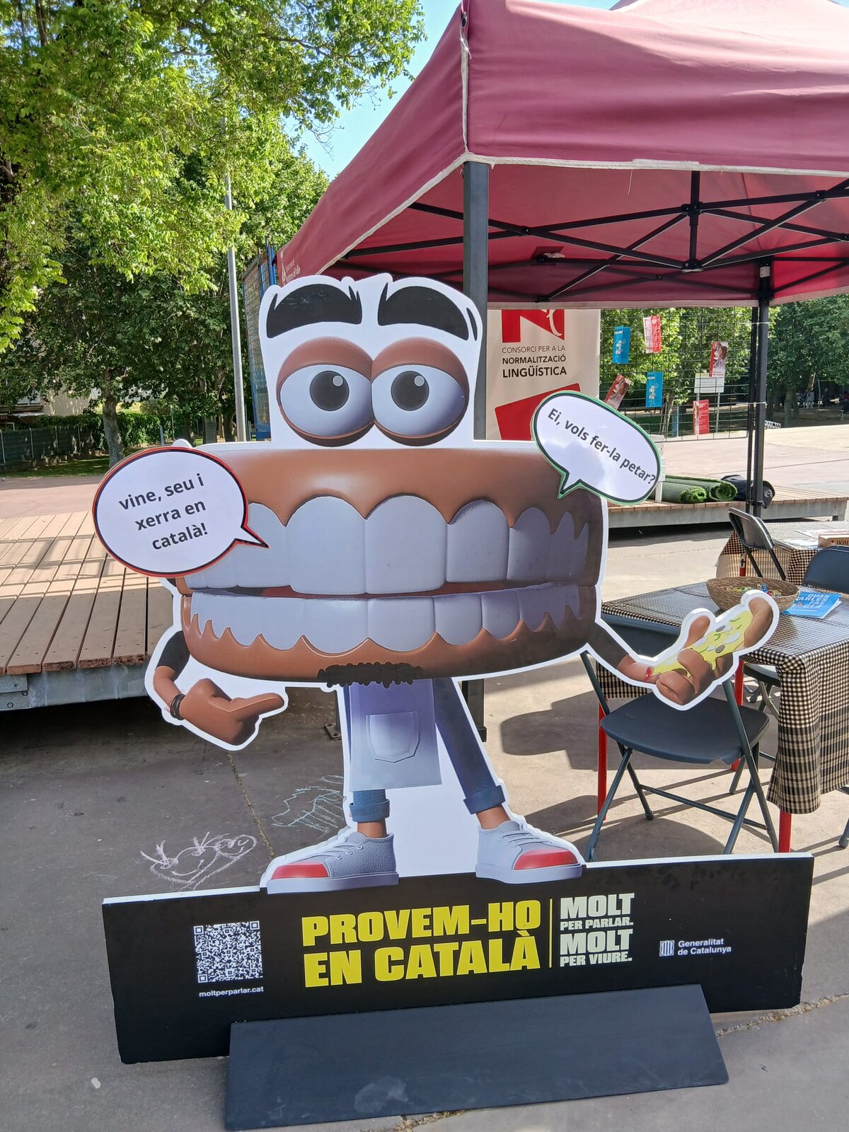 Aquest ha estat un Sant Jordi molt animat a Montornès. Des de primera hora del matí es va muntar el “Catalanòdrum”, un espai que volia reproduir la sala del Casal de Cultura, que és el punt de trobada del Voluntariat per la llengua. Allà s’hi va instal·lar la Queta, que amb unes bafarades demanava a la gent que s’animés a fer-la petar en català. També hi teníem les taules i les cadires de la Sala Riu Mongent del Casal. En una de les taules s’hi va col·locar un joc de l’oca una mica particular, ja que era un joc de llengua, i tant en aquesta taula de joc, com en les altres també hi havia la carpeta del VxL amb un menú de temes relacionats amb Sant Jordi per promoure la conversa: