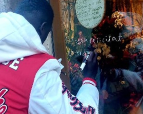 Alumnes dels cursos de català escriuen fragments de poemes als vidres d'establiments o equipaments culturals de la ciutat