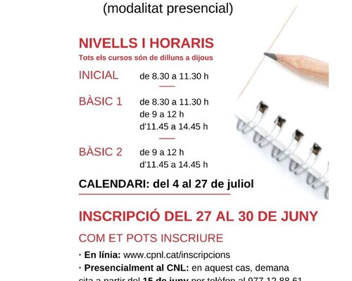 Les inscripcions per als cursos del Consorci per a la Normalització Lingüística es poden formalitzar presencialment o en línia, mitjançant la plataforma d'inscripció i tràmits que s'ha obert el 27 de juny a les 9 h i es tancarà el 30 de juny a les 20 h En el cas concret dels cursos del Centre de Normalització Lingüística de l'Àrea de Reus Miquel Ventura, se n'ofereixen sis a Reus de nivell Inicial, Bàsic 1 i Bàsic 2, i el Servei Local de Català de Cambrils impartirà un Bàsic 1.