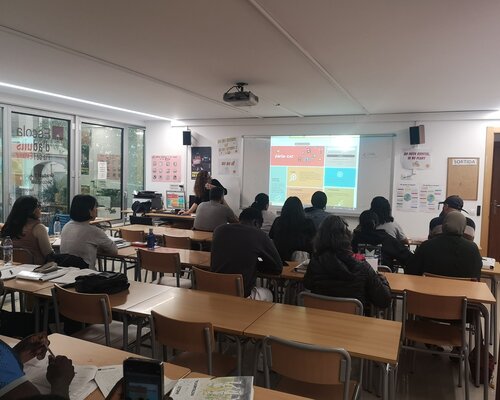 Una parella lingüística de Castellbisbal explica el Voluntariat per la llengua als alumnes del Bàsic 3