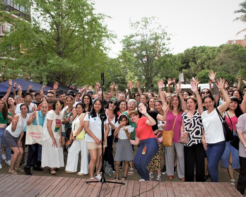 Els alumnes de l'Oficina de Català de Premià de Dalt celebren el final de les classes amb una sessió de ioga amb la Liz, alumna de català i instructora de ioga a la plaça del Mil·lenari.