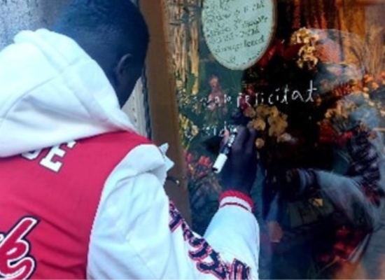 Alumnes dels cursos de català escriuen fragments de poemes als vidres d'establiments o equipaments culturals de la ciutat