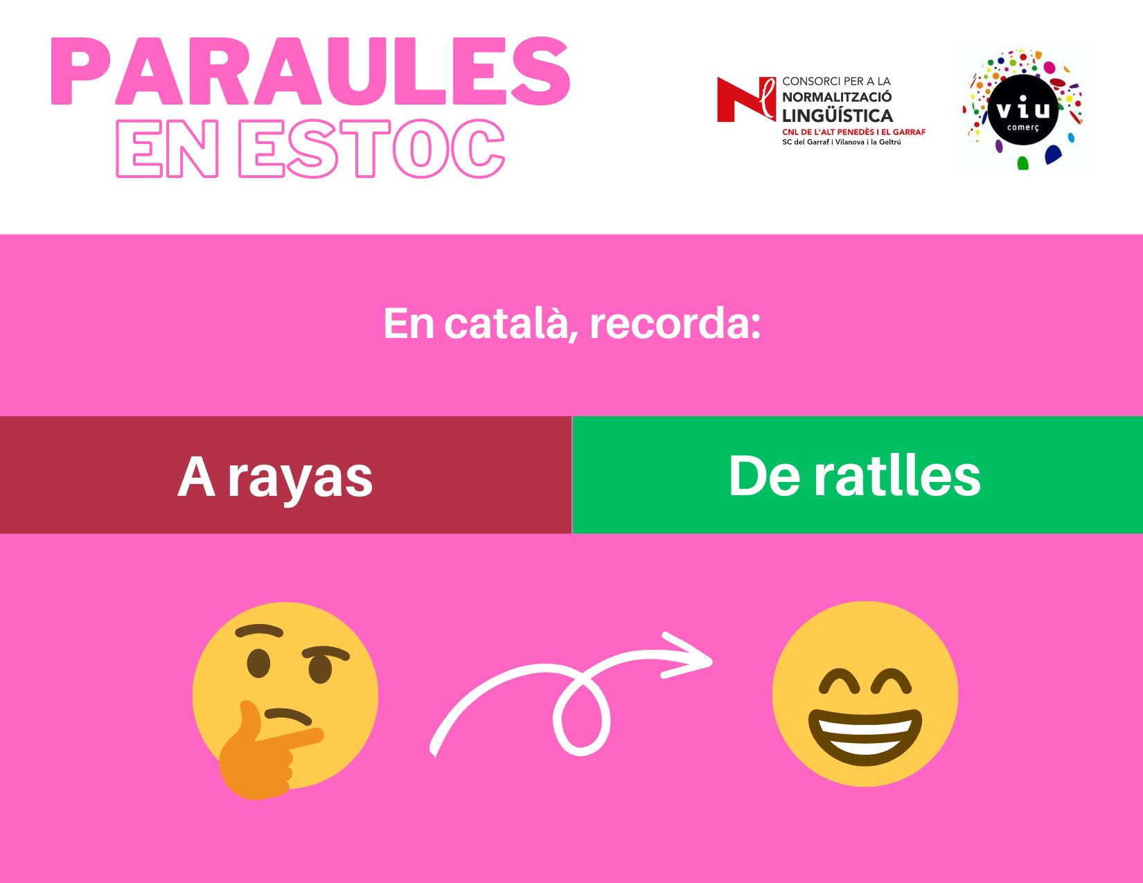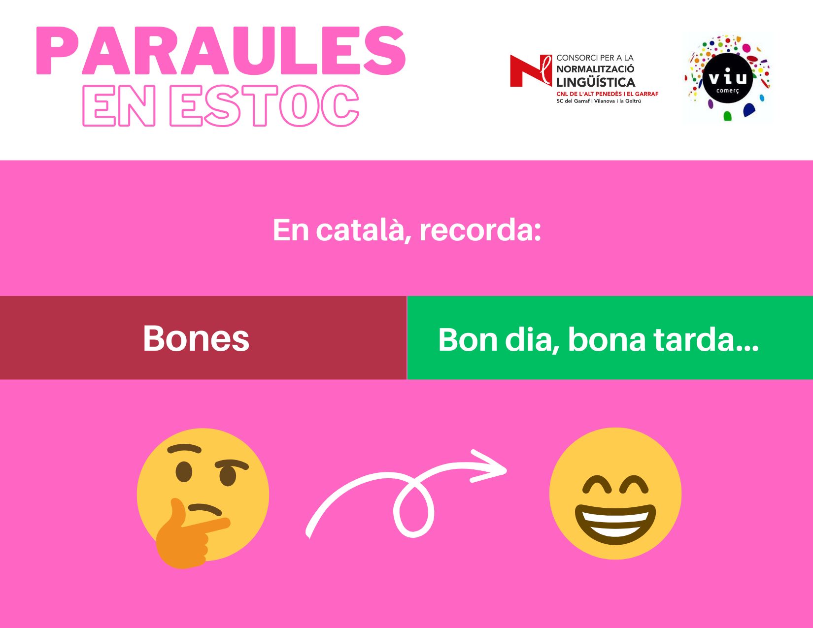 Qualsevol tracte comercial comença per establir una comunicació eficaç, en directe o través dels canals digitals. Per això, un element que cal cuidar especialment és la llengua d'atenció als clients. Per ajudar a oferir una imatge lingüística de qualitat en català, Viu Comerç i el Servei de Català del Garraf i de Vilanova i la Geltrú iniciem a partir del 15 de maig de 2024 una col·laboració periòdica per ajudar a millorar l'ús de la terminologia específica del sector comercial. Amb les postals "Paraules en estoc" els associats a Viu Comerç rebran cada mes dues propostes de paraules que susciten sovint dubtes lingüístics perquè puguin incorporar la forma adequada en les seves comunicacions.
