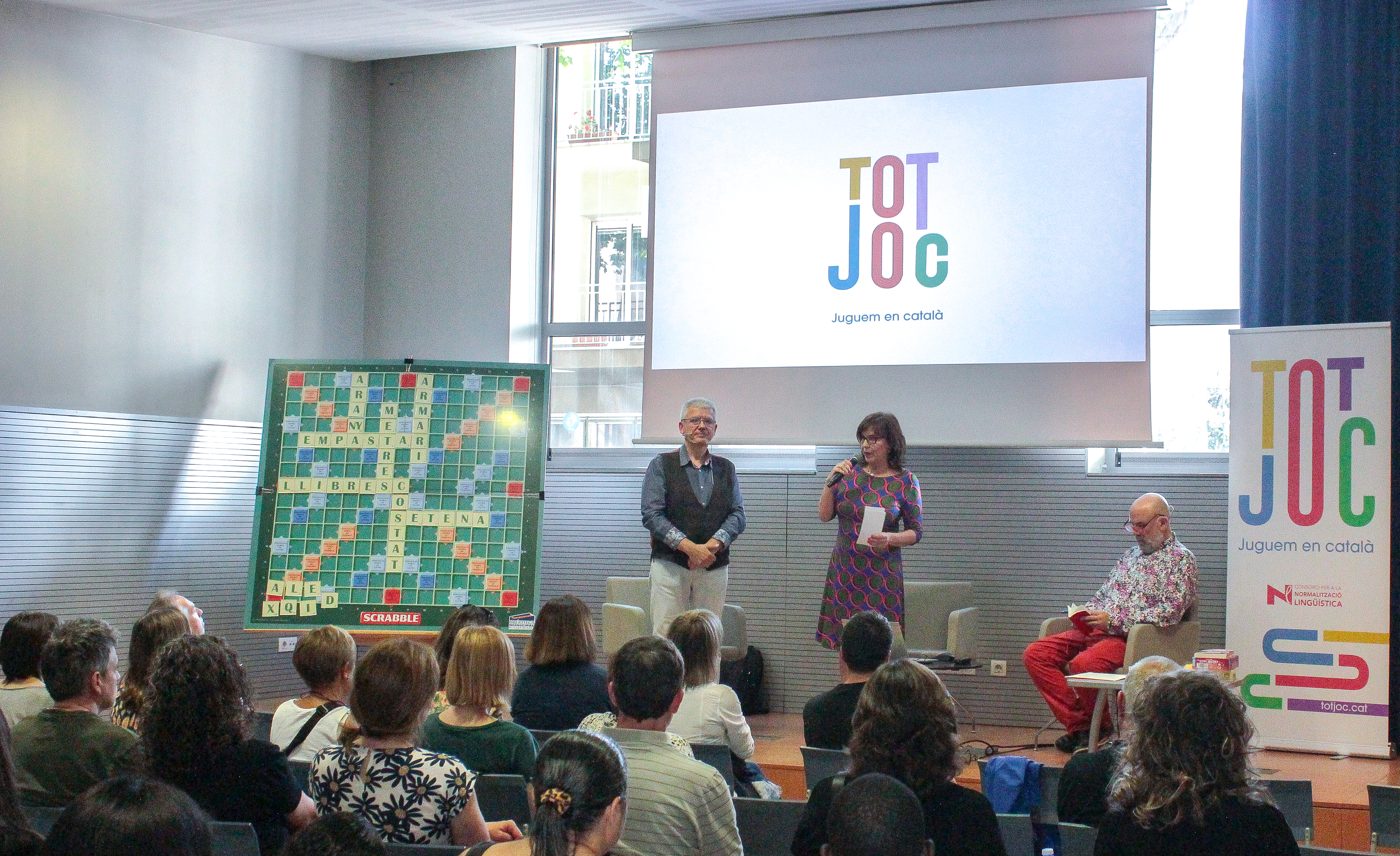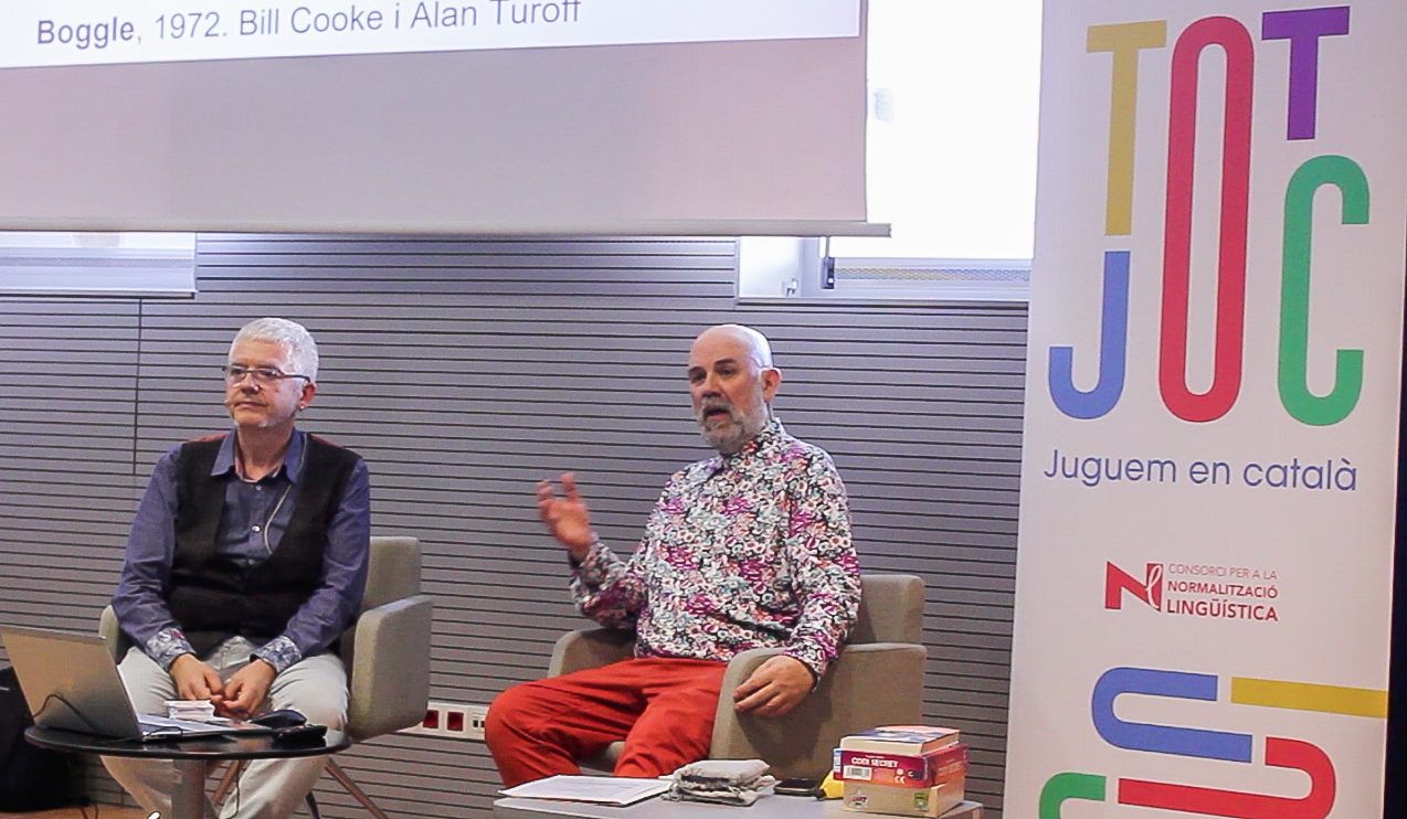 Després de la presentació, Màrius Serra i Oriol Comas, coneguts experts en l'ús lúdic de la llengua, han fet una xerrada sobre jocs en català amb la participació activa de la cinquantena d'assistents a l'acte. Els protagonistes de la xerrada han estat els jocs de taula.