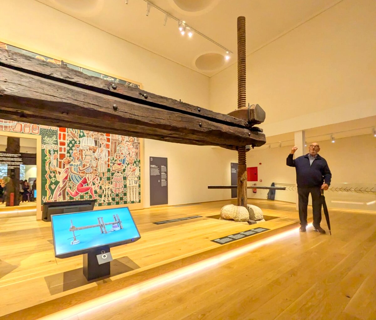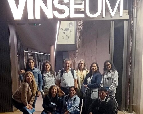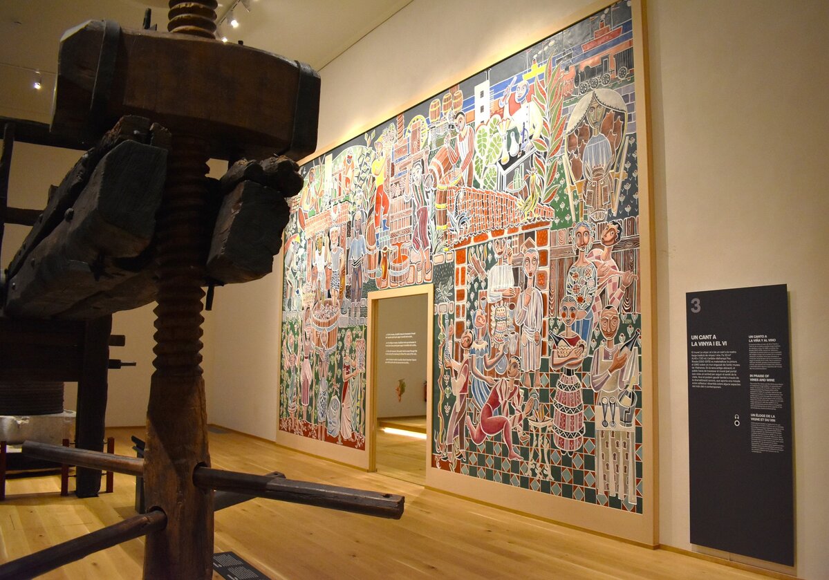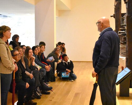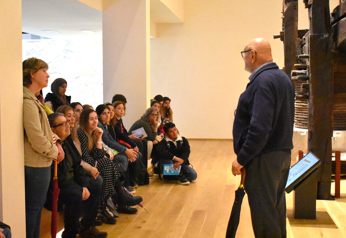 A continuació, a la plaça del Vi, a la planta baixa del Vinseum, els assistents es van organitzar en dos grups per rebre les explicacions de dos voluntaris. El Rossend Castells va ser l'encarregat d'explicar l'origen i les característiques de la premsa que s'exposa en aquesta planta i el Josep Ribas va parlar sobre les varietats i les denominacions d'origen dels vins catalans.