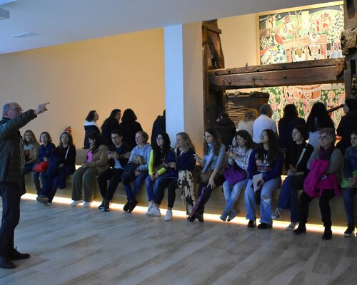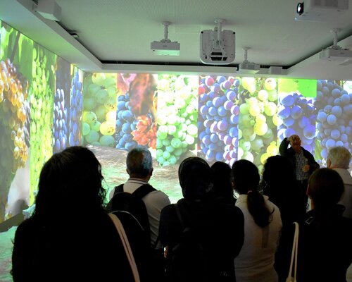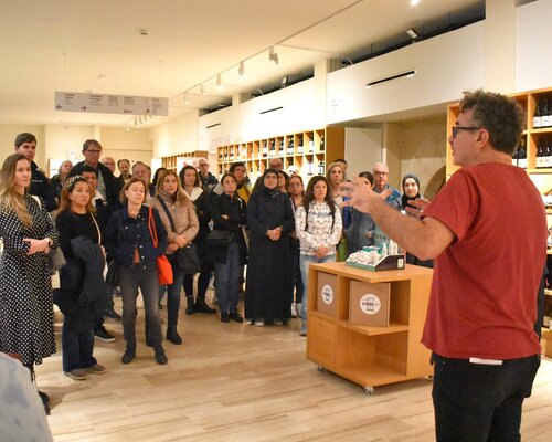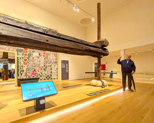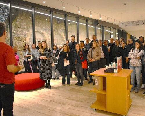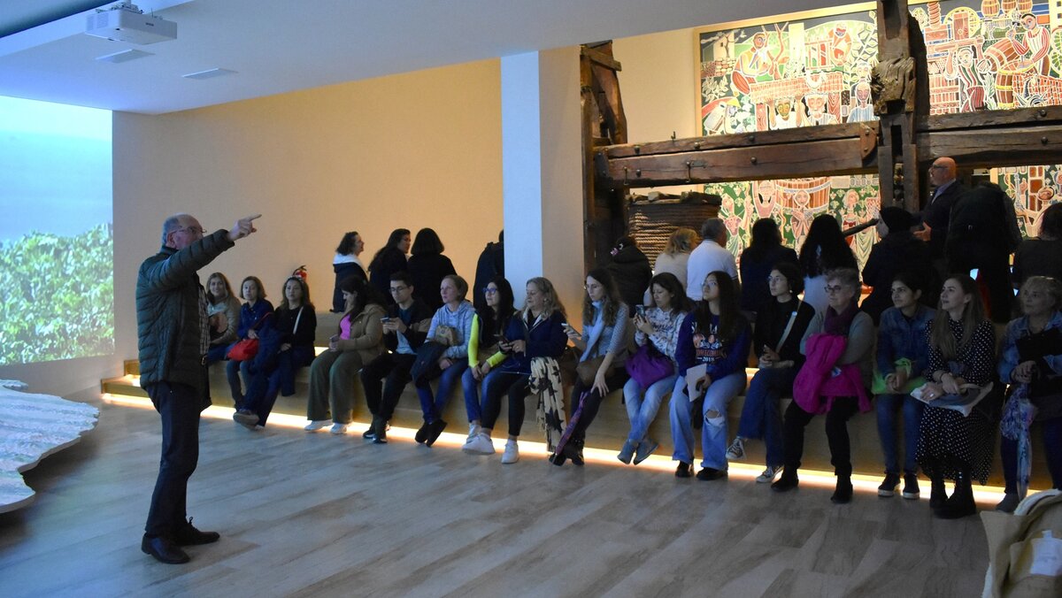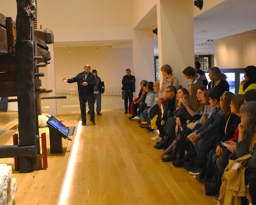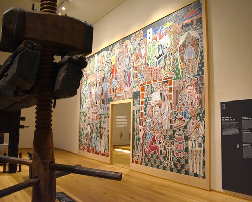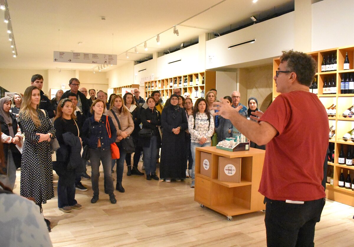 A continuació, a la plaça del Vi, a la planta baixa del Vinseum, els assistents es van organitzar en dos grups per rebre les explicacions de dos voluntaris. El Rossend Castells va ser l'encarregat d'explicar l'origen i les característiques de la premsa que s'exposa en aquesta planta i el Josep Ribas va parlar sobre les varietats i les denominacions d'origen dels vins catalans.