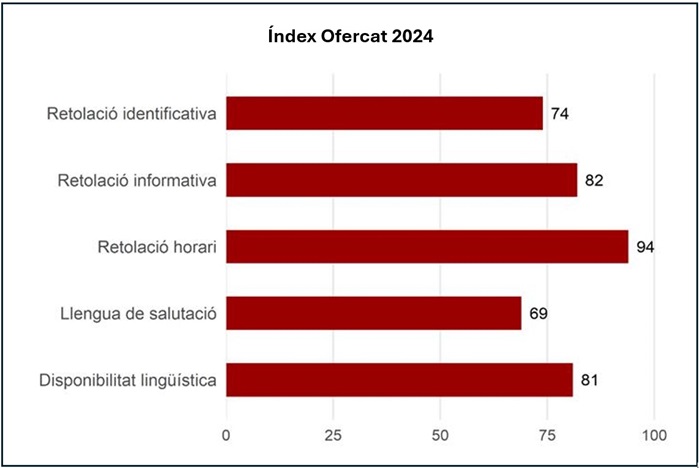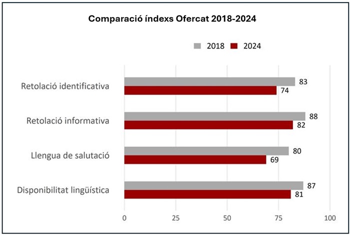 L'Estudi Ofercat permet estudiar l'evolució de l'ús del català al comerç amb l'índex Ofercat, un indicador lingüístic sintètic que mesura l'oferta de llengua catalana de 0 a 100. Quant a la presència del català en la llengua oral, s'ha produït una reculada en l'ús del català com a llengua de salutació entre les dades recollides en l'estudi de 2024 (69 punts sobre 100 en l'índex) i les que es van obtenir el 2018 (80 punts). Així mateix, pel que fa a l'adaptació del català quan el client l'utilitza, l'índex ha baixat 6 punts respecte a les dades obtingudes el 2018, de 87 a 81.