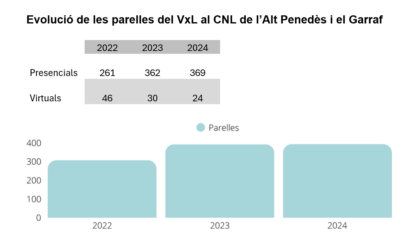 El 2024, un total de 393 parelles lingüístiques van participar en el VxL al CNL, 369 de presencials i 24 de virtuals. El programa es va desplegar a les poblacions del CNL que tenen un servei o una oficina de català (Vilanova i la Geltrú, Vilafranca del Penedès, Sant Pere de Ribes i les Roquetes, Sitges i Sant Sadurní d'Anoia).