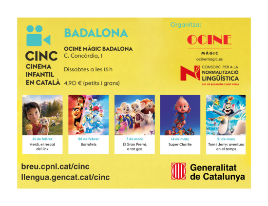 El cinema Ocine del Màgic Badalona torna a obrir les portes al cinema infantil en català. Un cop més, ens aproparà les millors històries i ens farà gaudir en família. Els dissabtes del 21 de febrer al 21 de març, a les 16 h, riurem i viurem aventures amb els personatges més pintorescos del cine. Preu únic reduït de 4,90 € per a petits i grans.