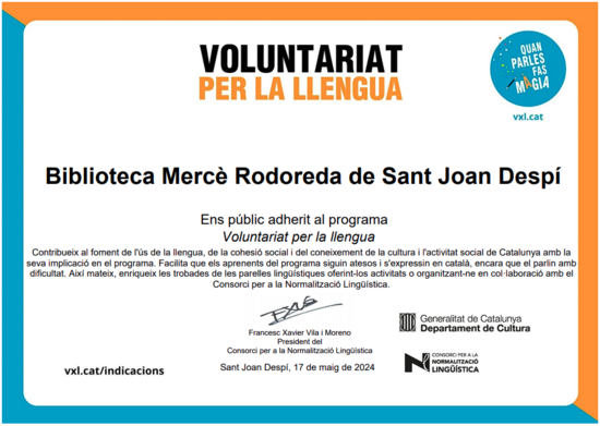 La Biblioteca Joan Margarit de Sant Just Desvern renova l'adhesió al Voluntariat per la llengua