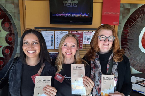 Tres alumnes de l'Elemental 3 de l'Oficina de Català d'Esparreguera col·laboren en la taula d'informació a La Passió